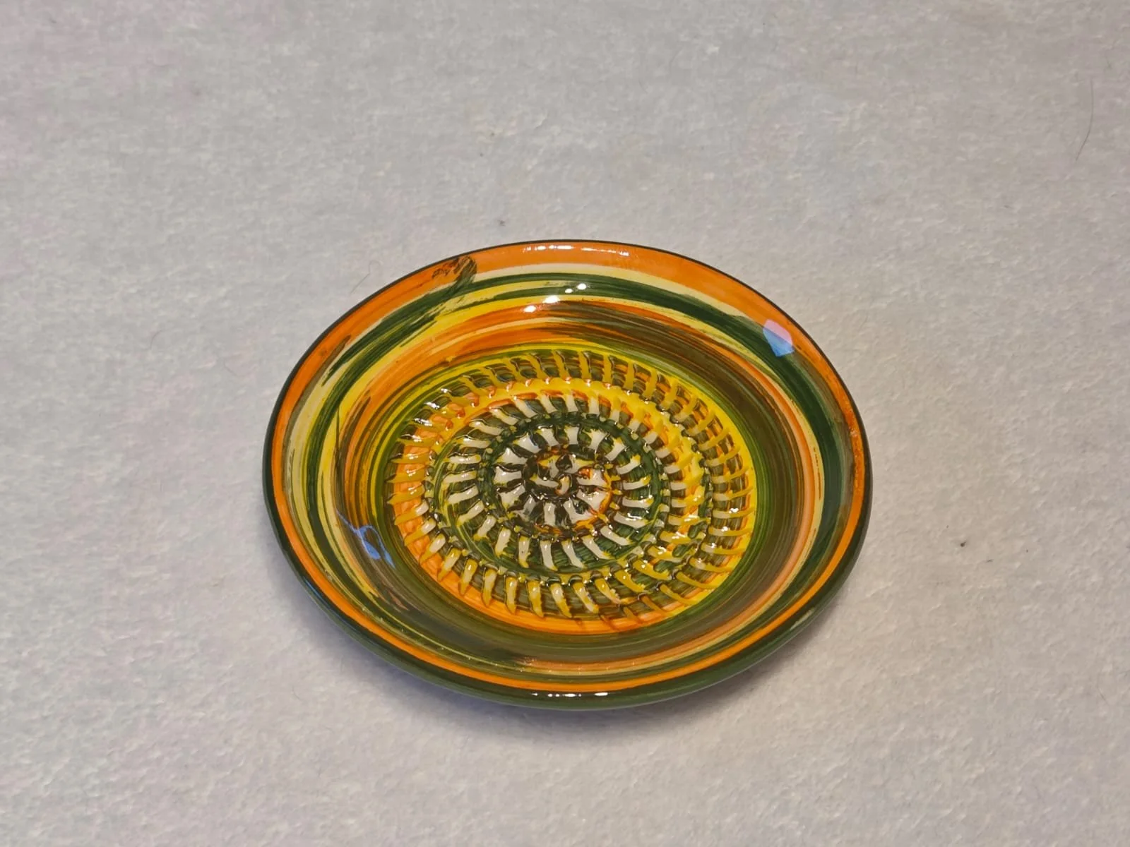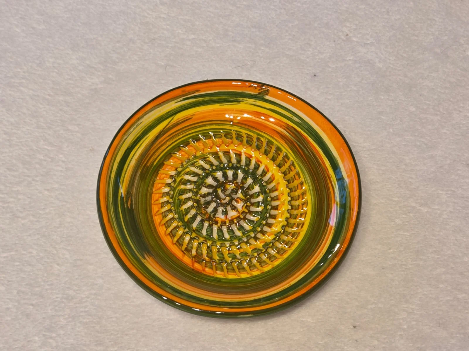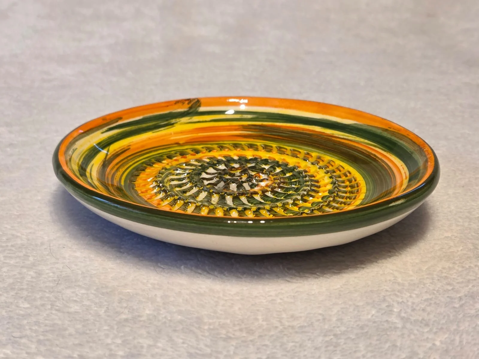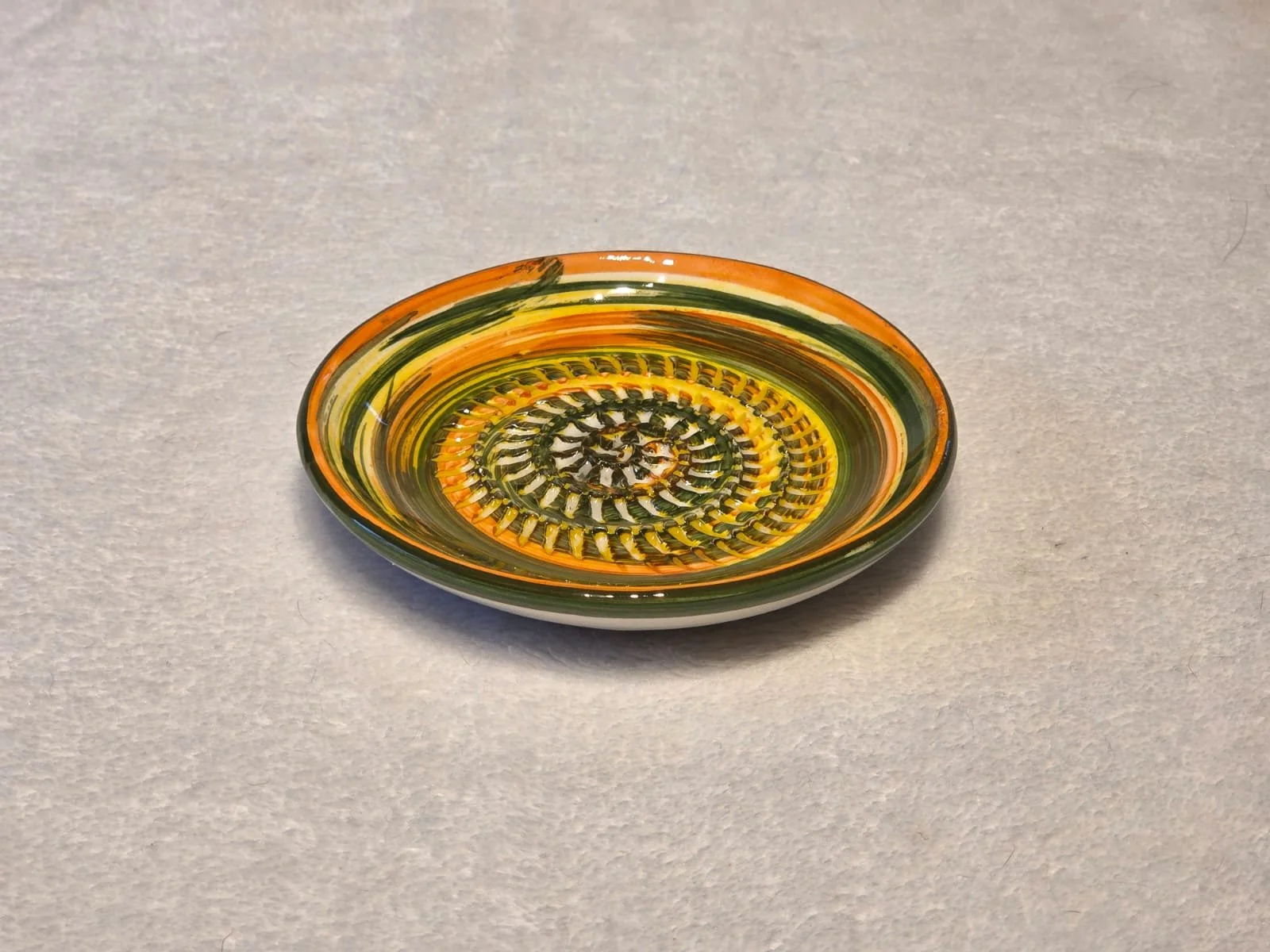 Spanish pottery garlic rasp, ginger grater green splatter ceramic plate