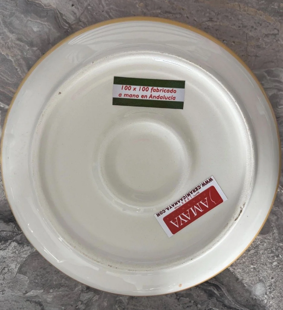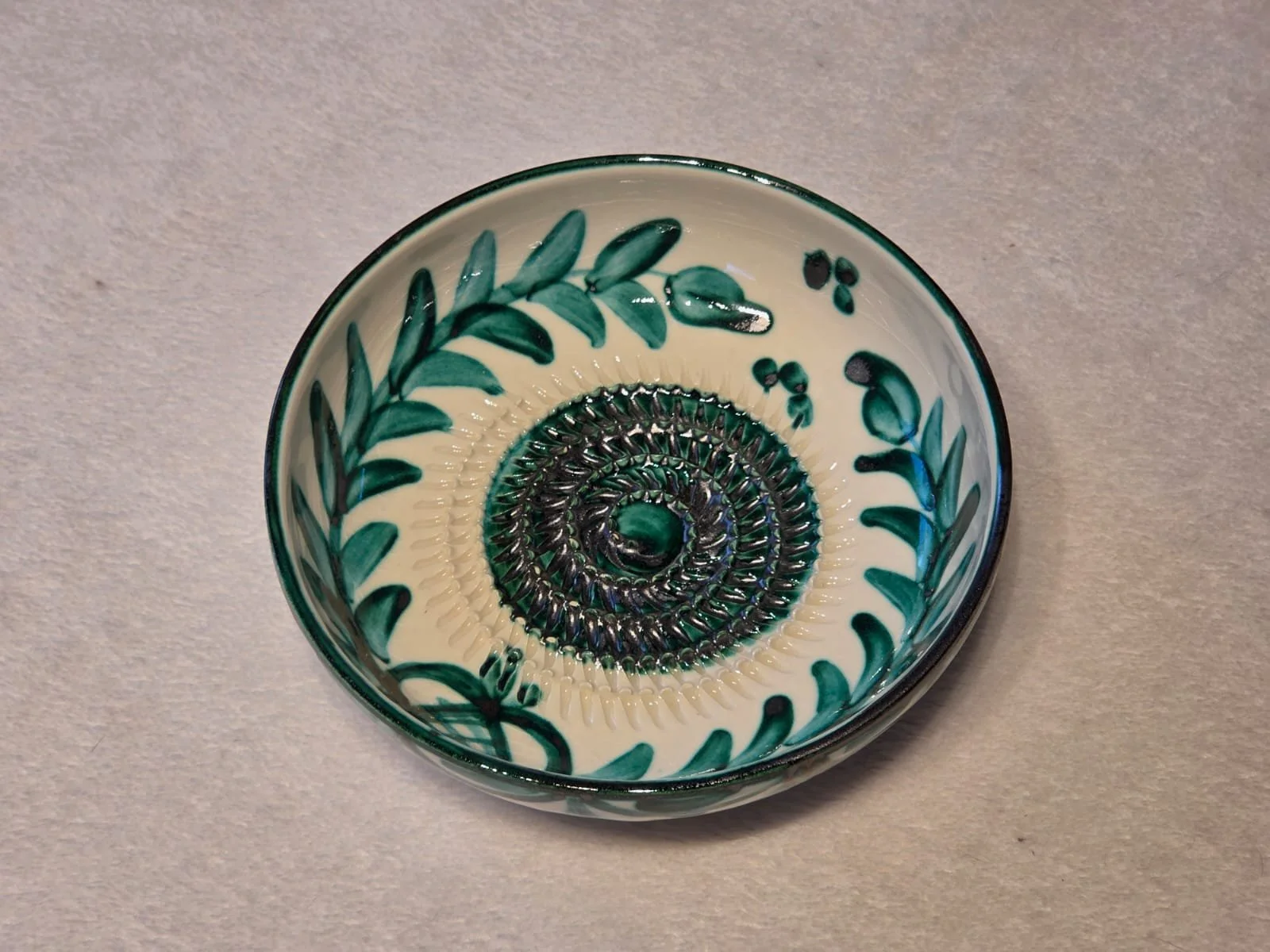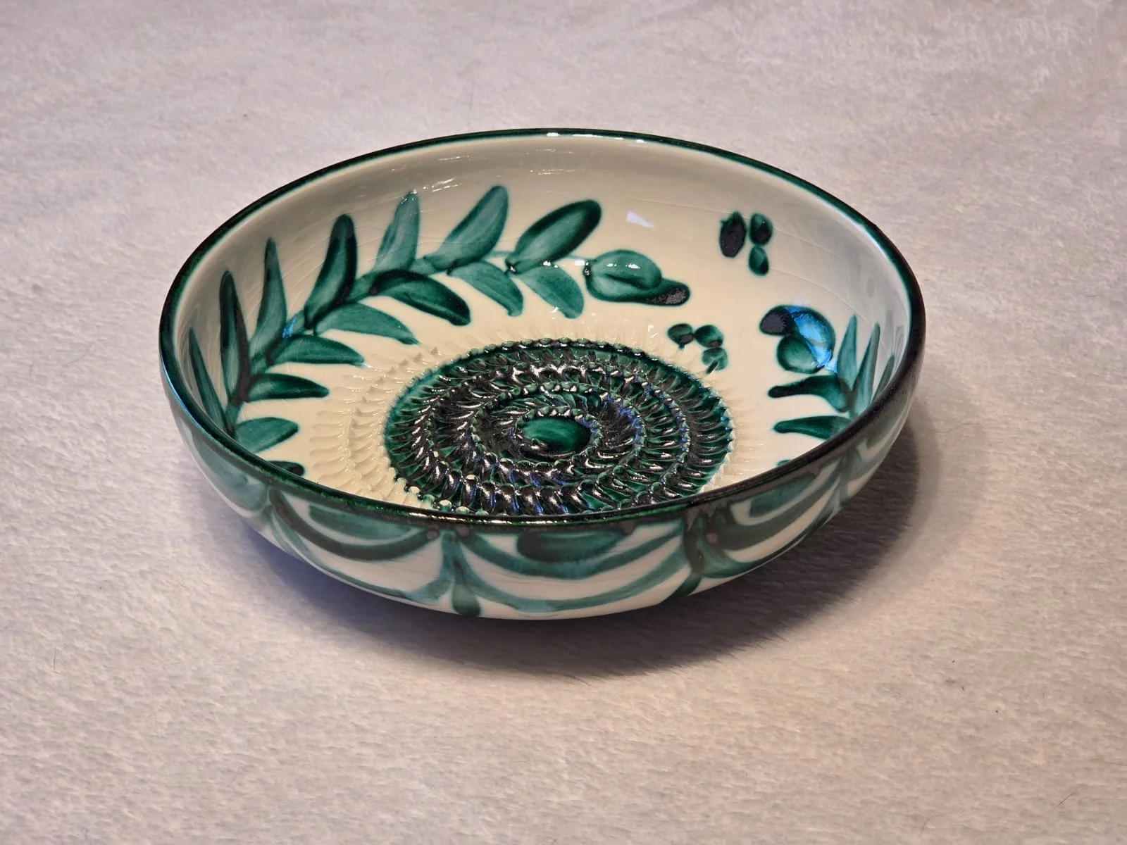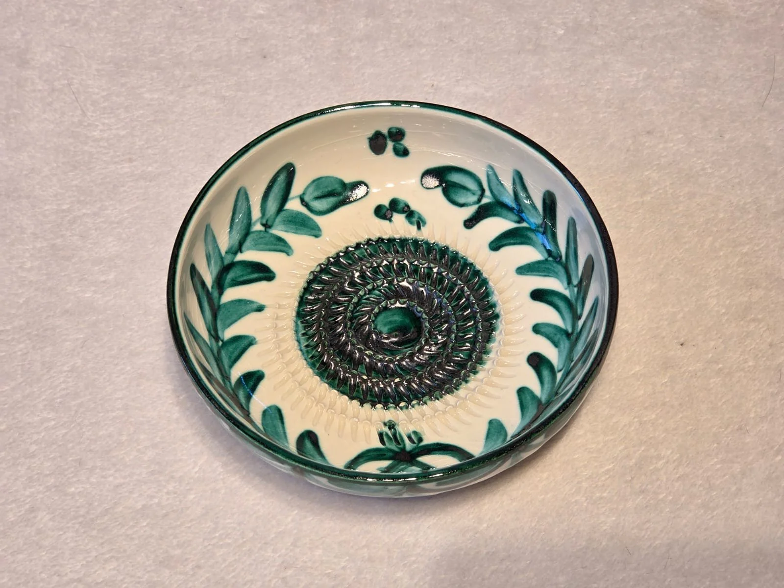 Spanish pottery garlic rasp, ginger grater green splatter ceramic plate