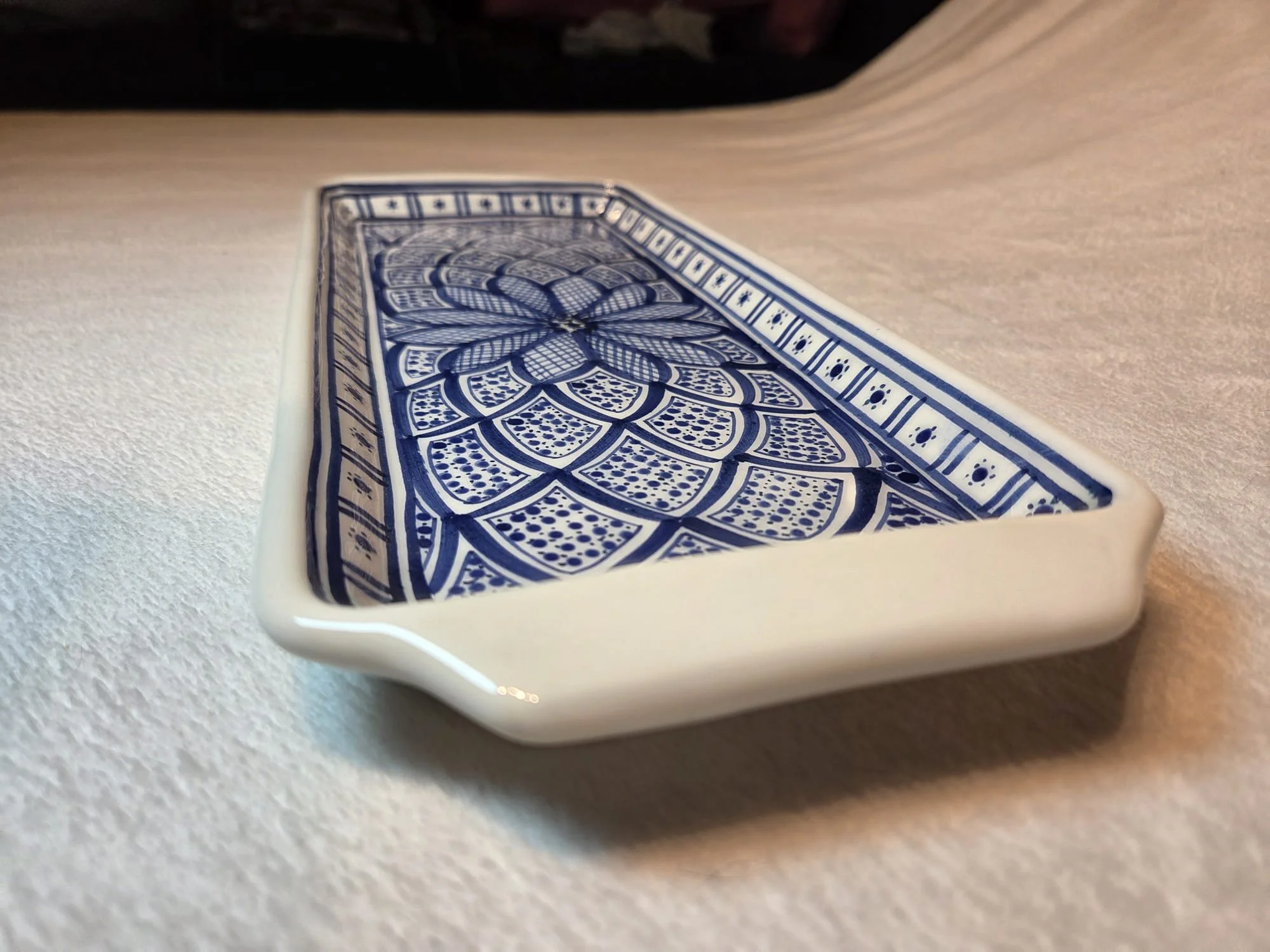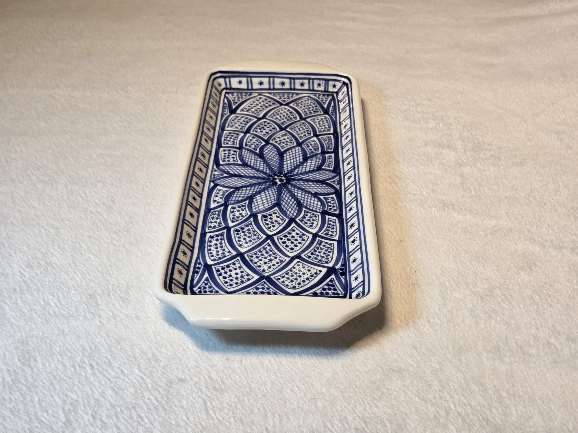 Spanish pottery spoonrest - handpainted white and blue spoon rest, trivet, spoon holder or teabag holder.