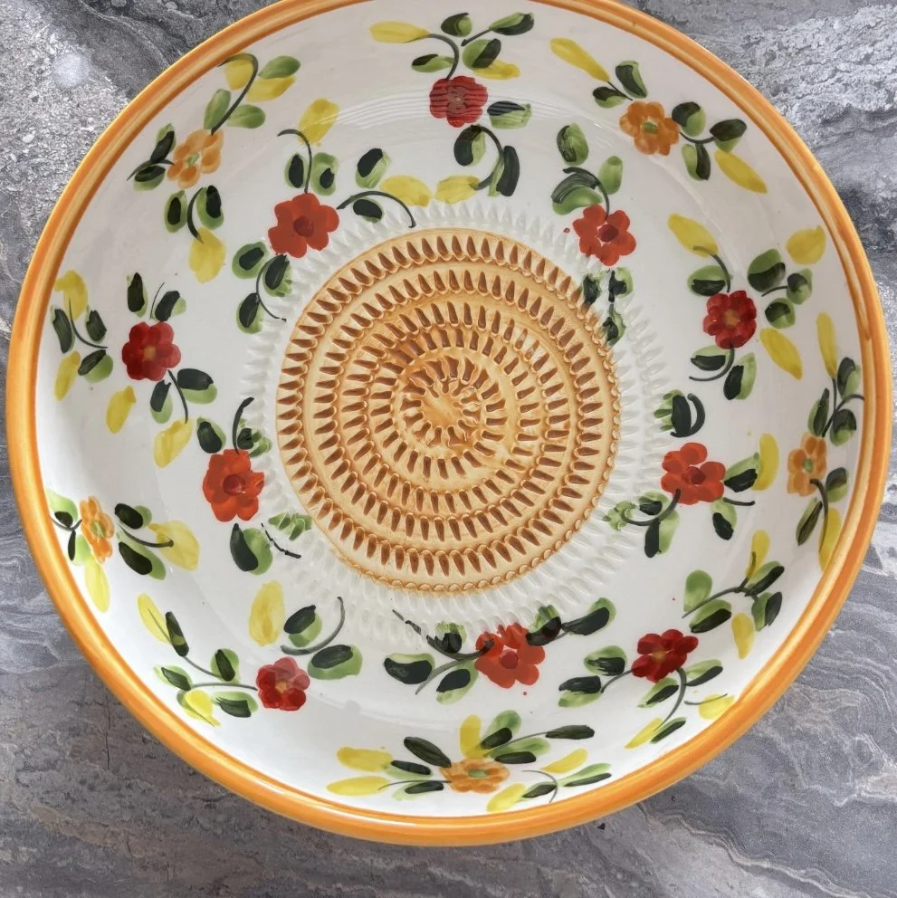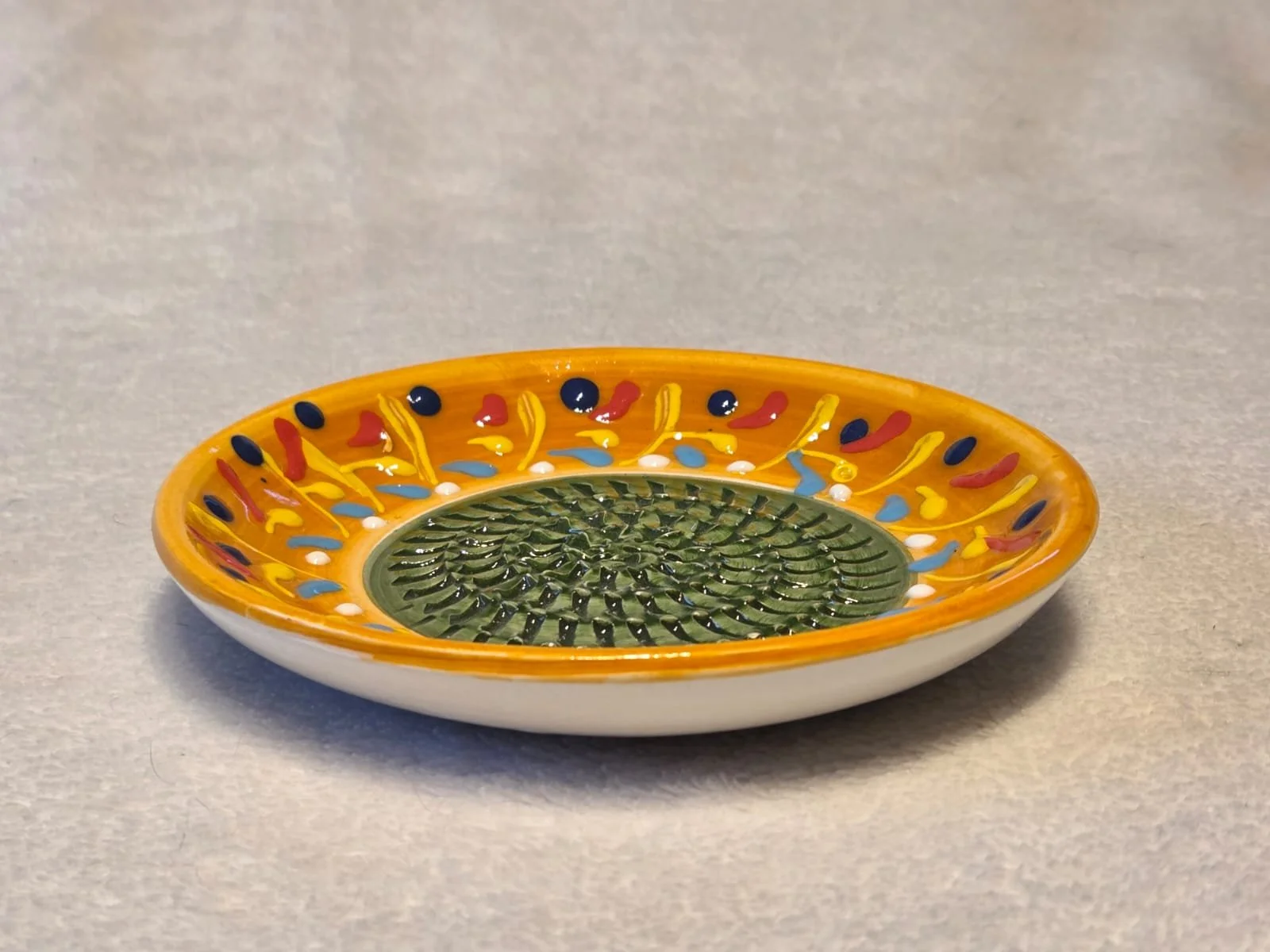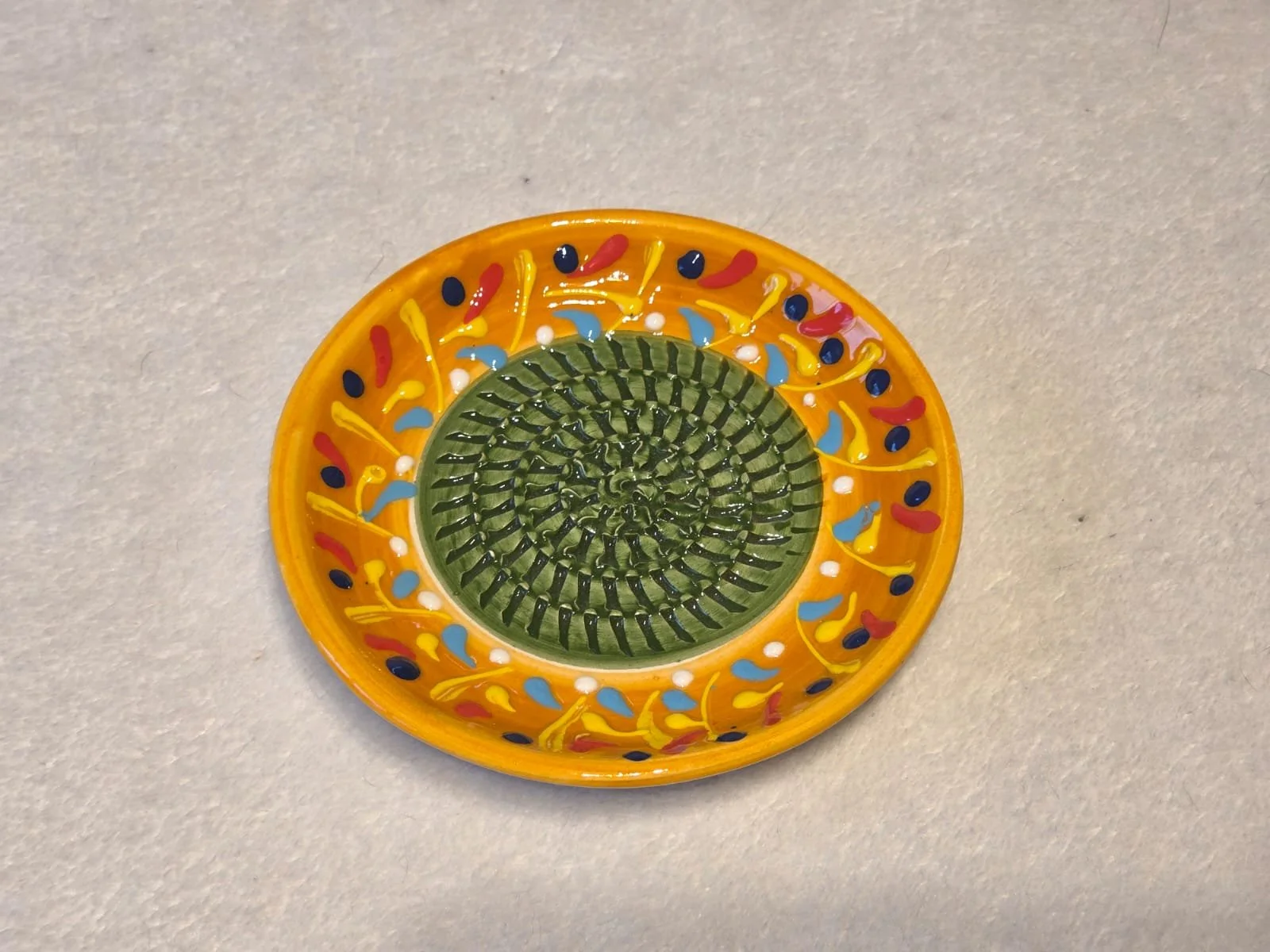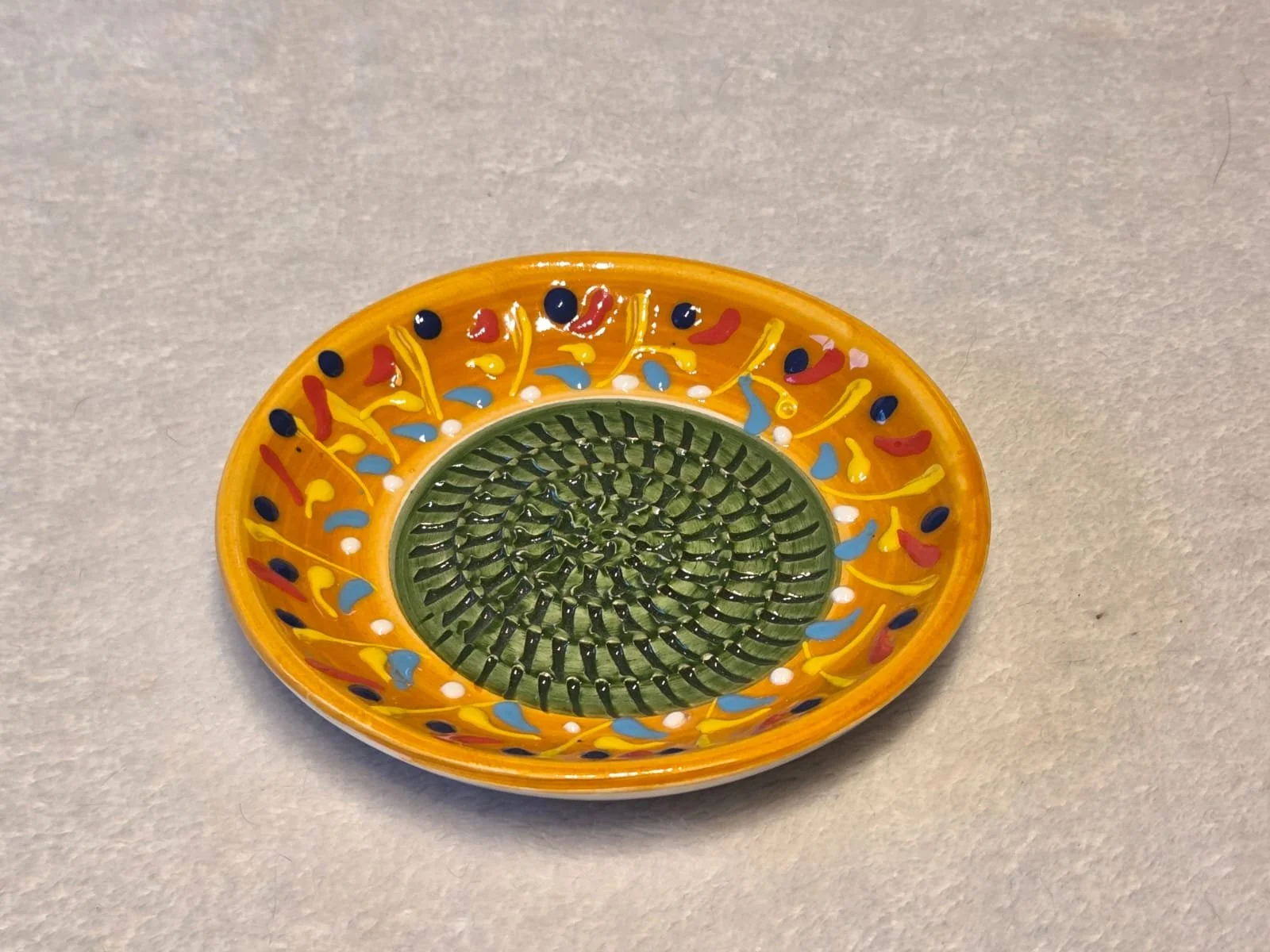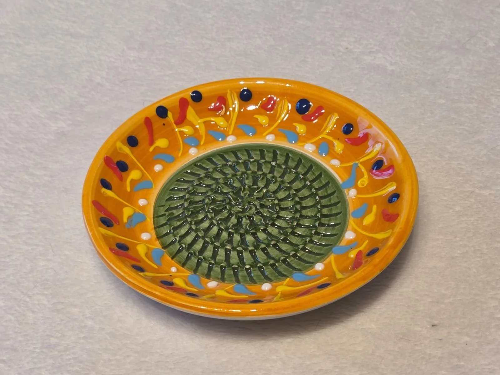 Spanish pottery garlic rasp, ginger grater colourful ceramic plate