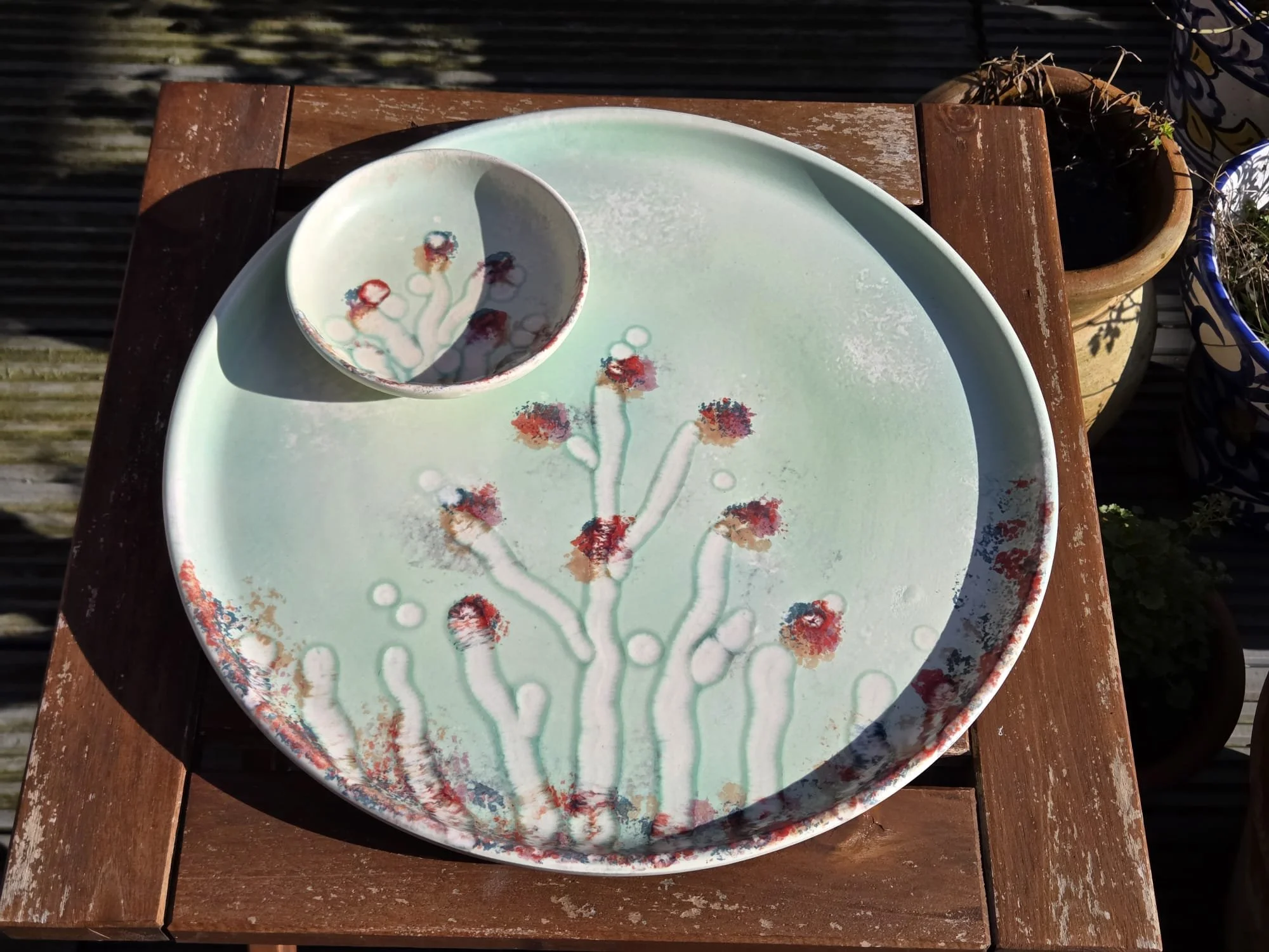 Tunisian handpainted serving dishes and plate set - large colourful serving dishes for snacks, dips, olives etc.