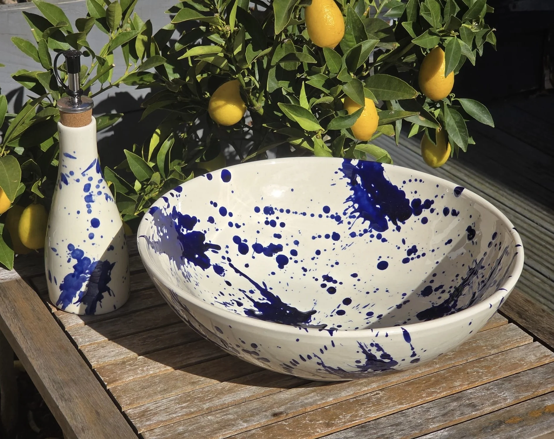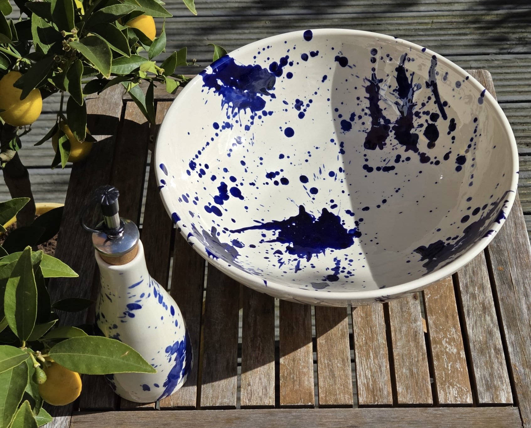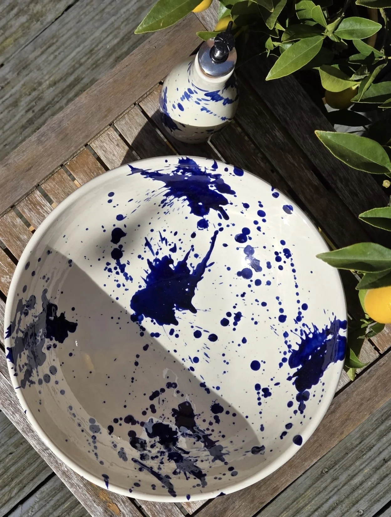 Spanish splatter platter, hand-painted large blue and white plate