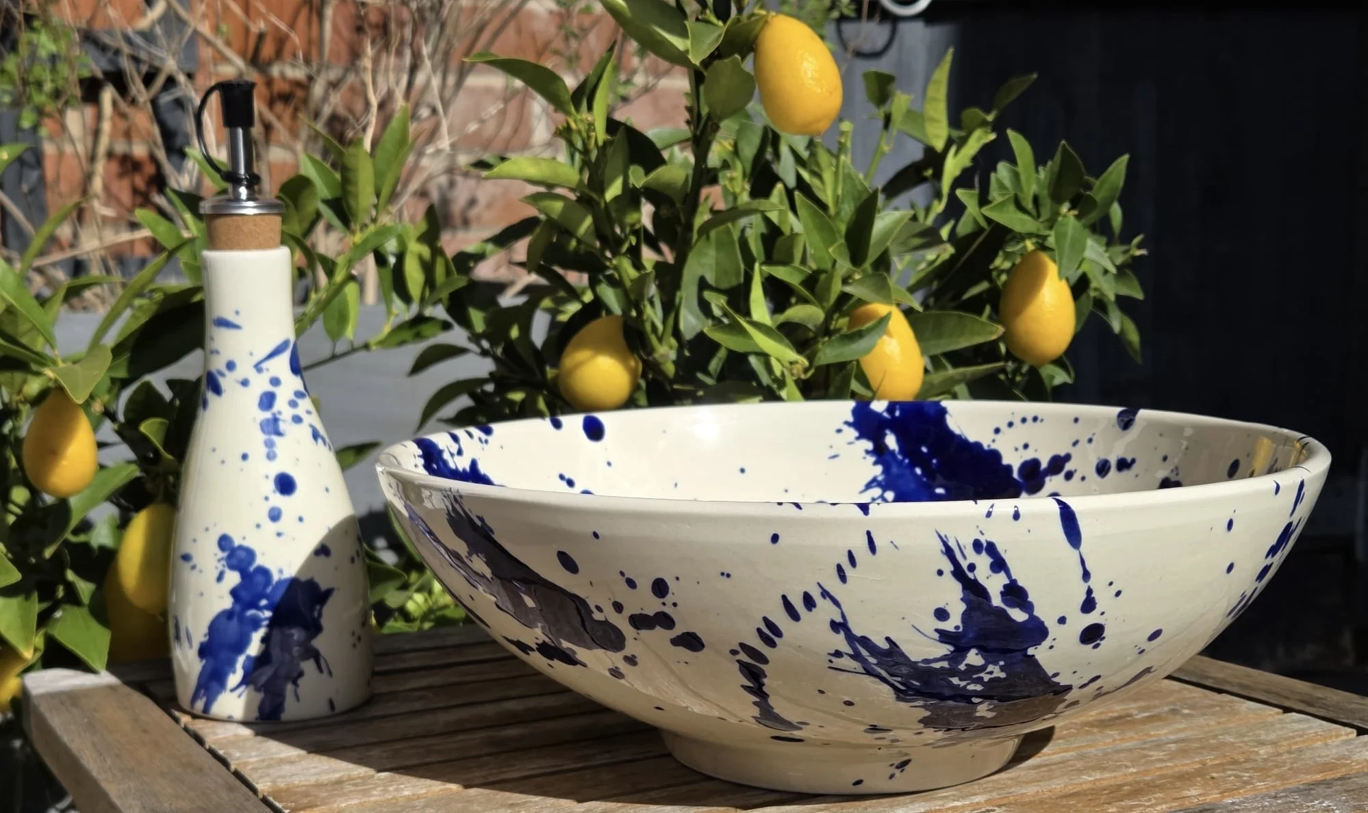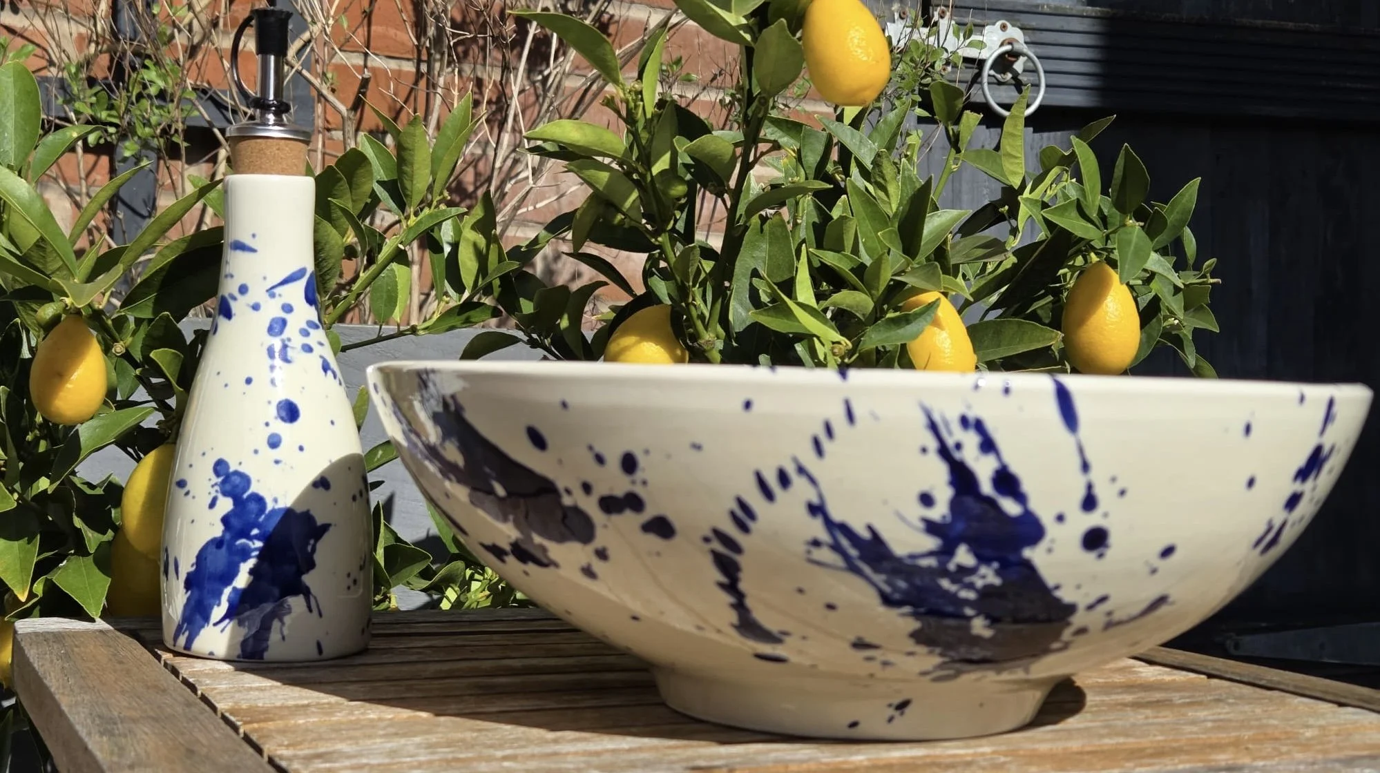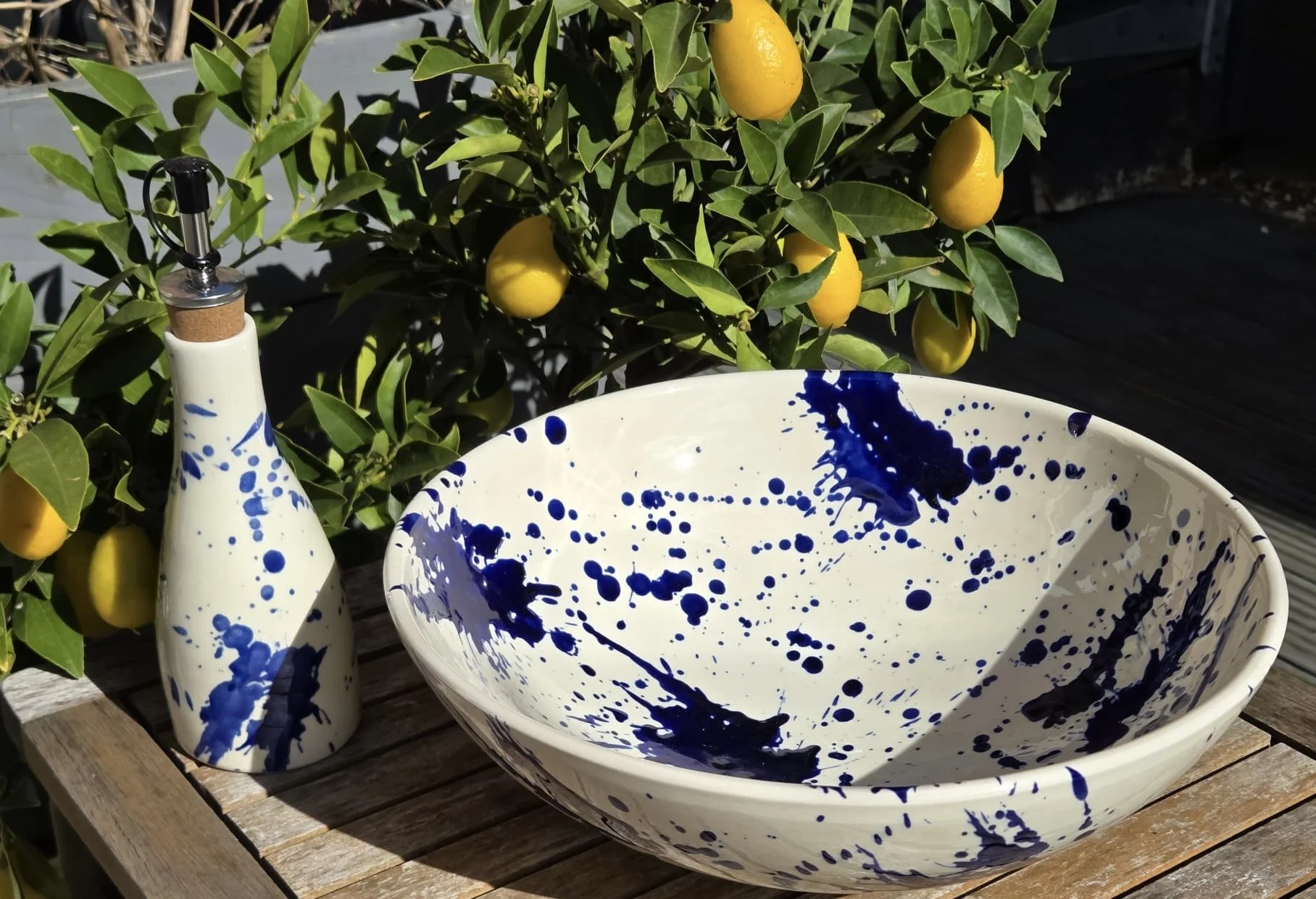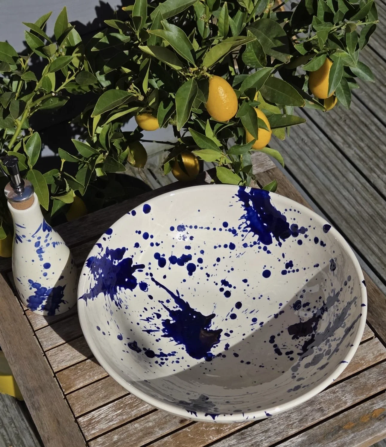 Spanish splatter platter, hand-painted large blue and white plate