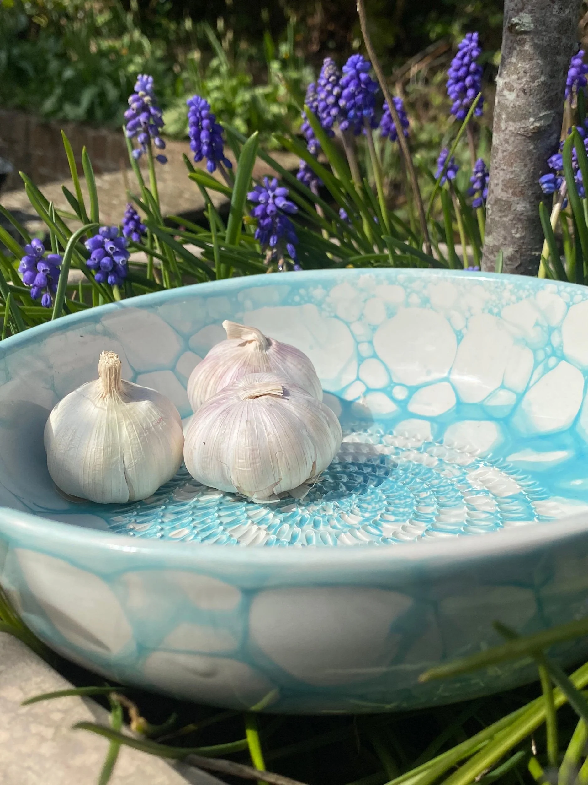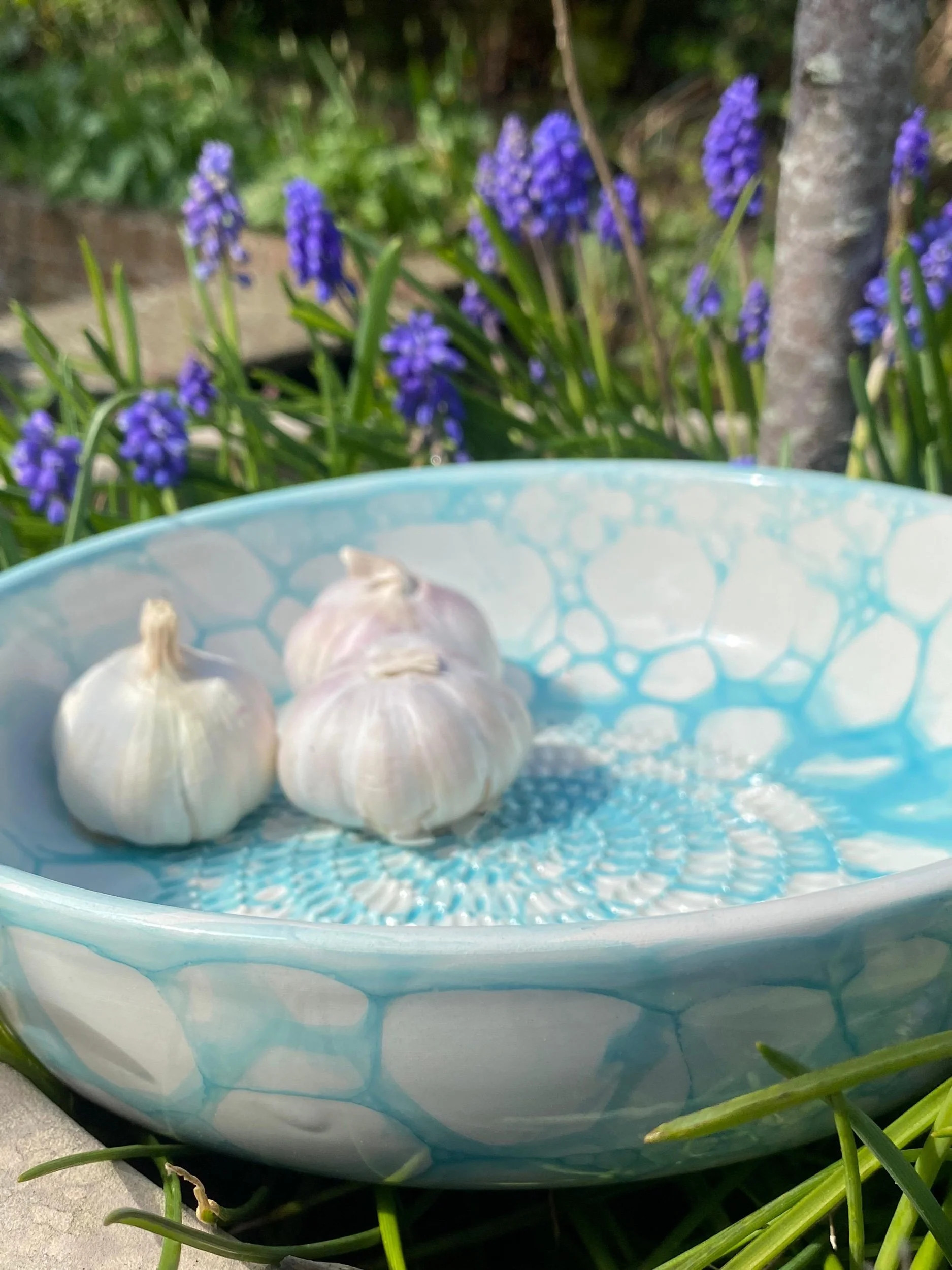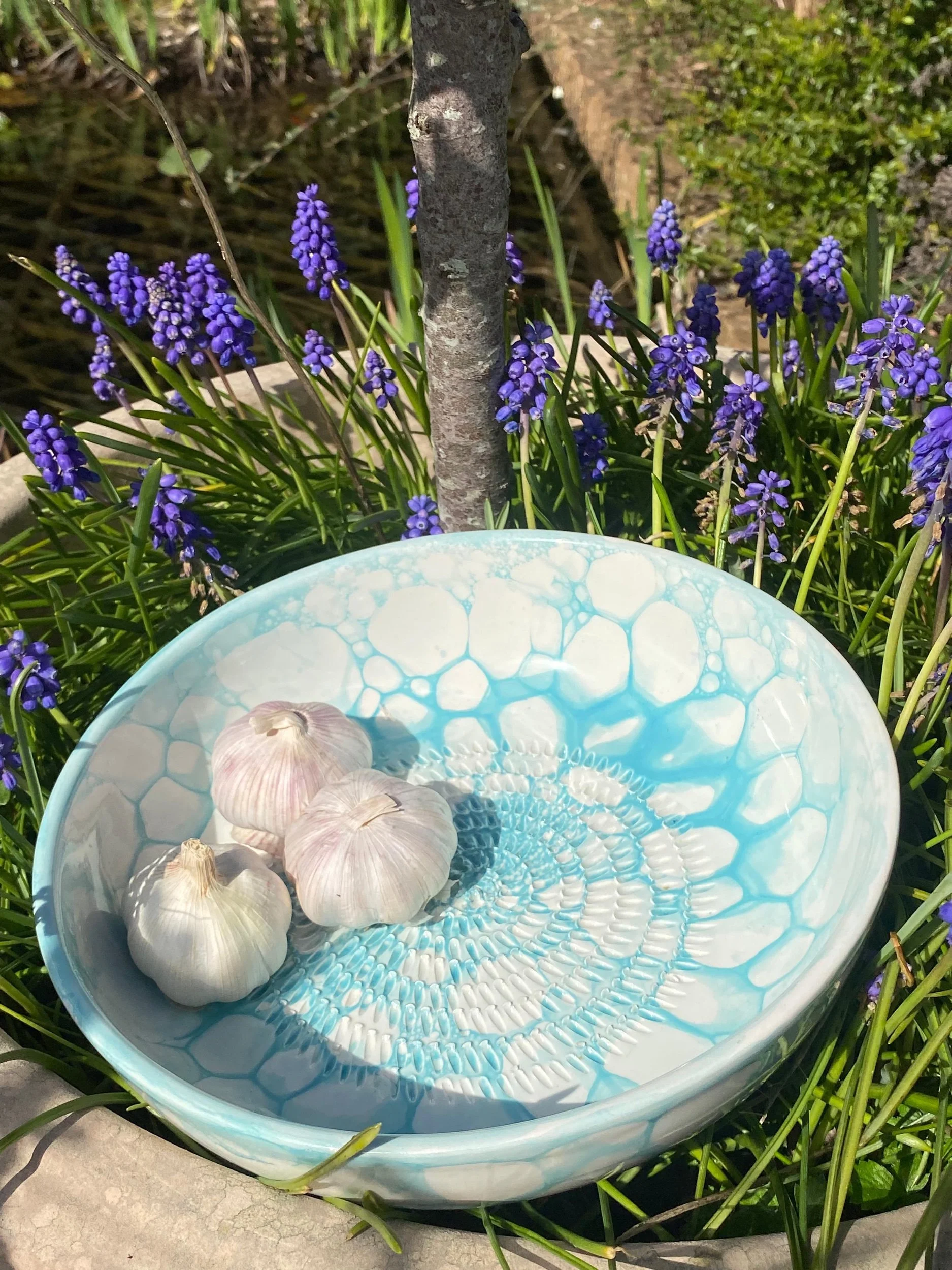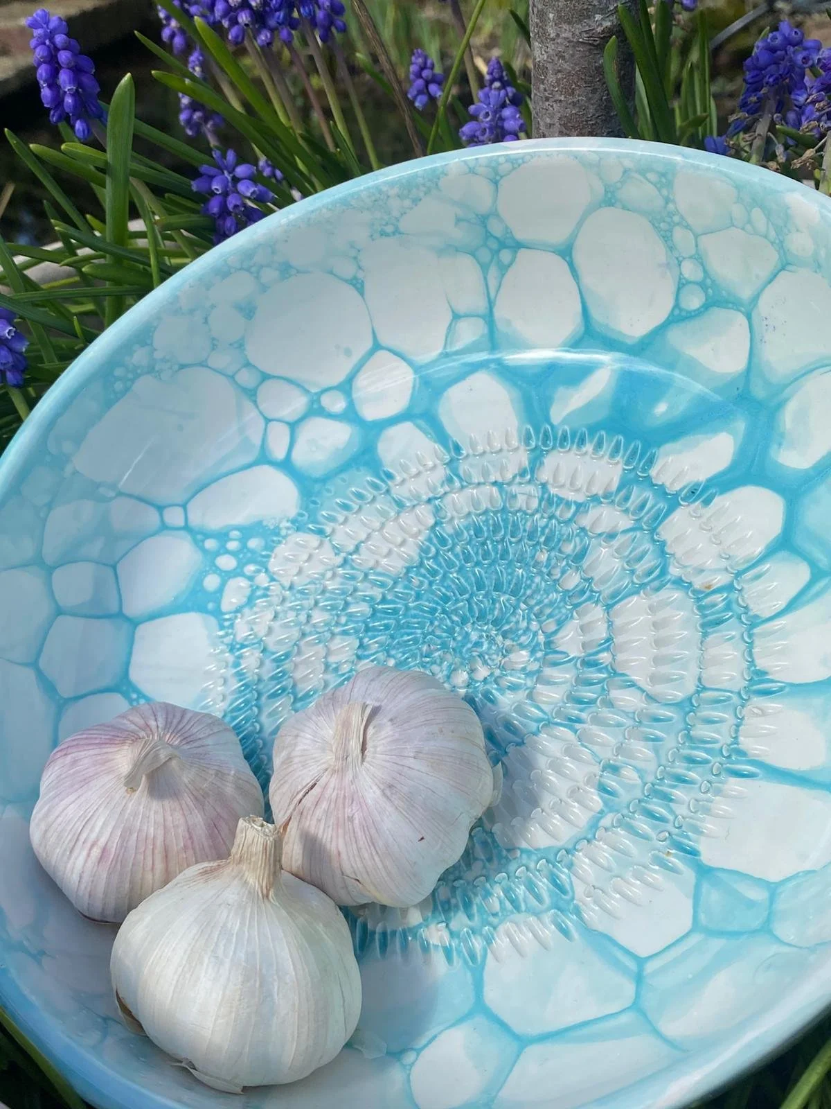 Spanish pottery garlic rasp, ginger, nutmeg, chocolate, tomato, onion grater - blue and white ceramic grater bowl