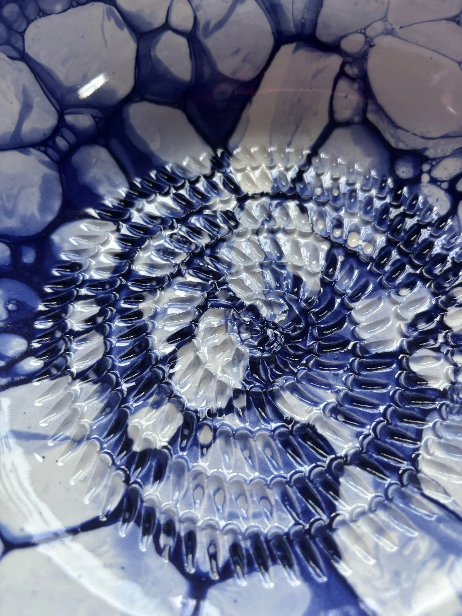 Spanish pottery garlic rasp, ginger, chocolate, nutmeg, tomato, onion, cucumber grater. Blue and white ceramic grater bowl
