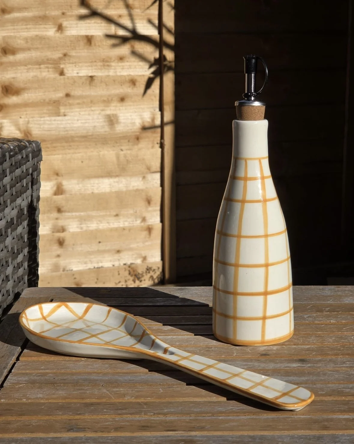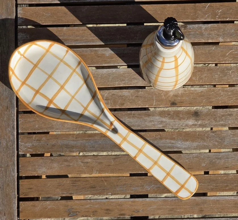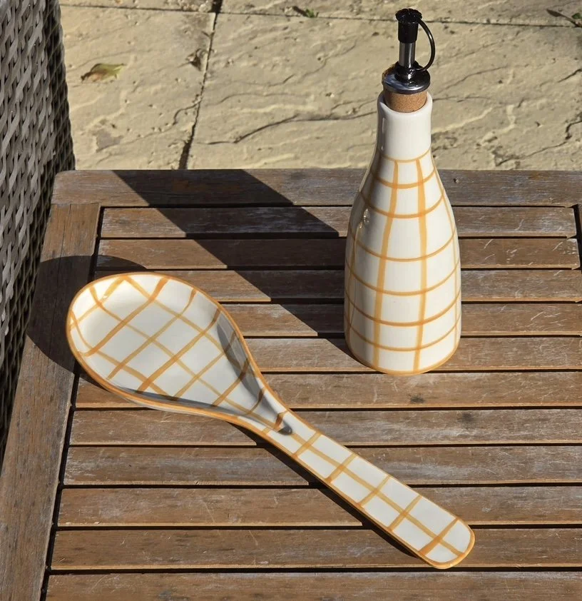 This is a beautiful ceramic spoon rest and matching drizzler which were hand-painted and handmade in the south of Spain.