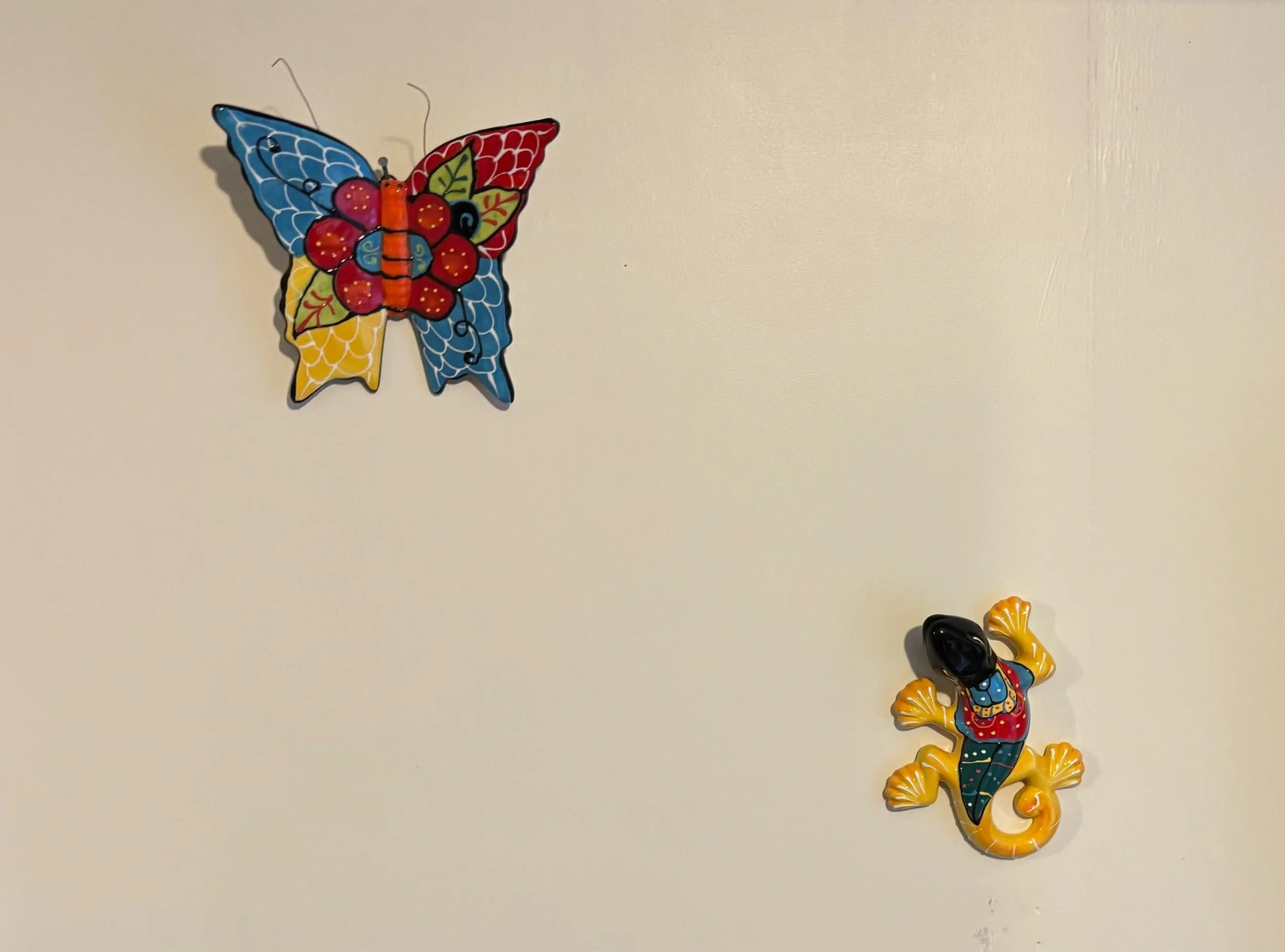 Beautiful handpainted colourful ceramic butterfly and lizard for the wall.
