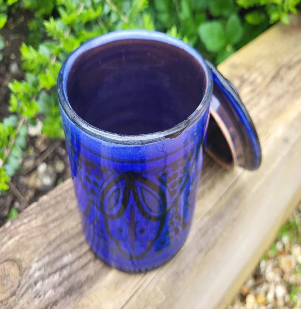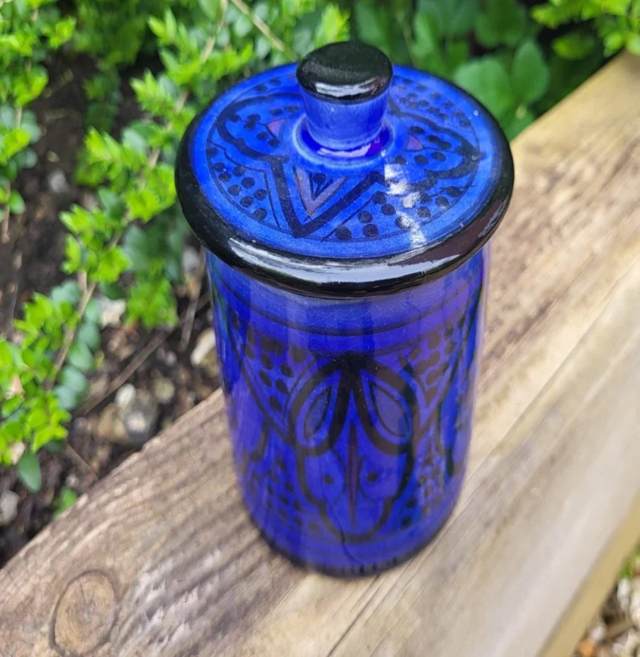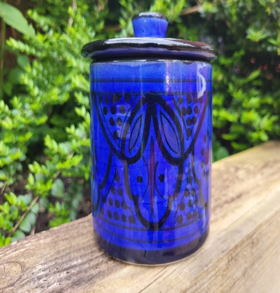 This is a handmade and hand painted Moroccan pot. It measures 13cm in height with the lid and 10cm across.