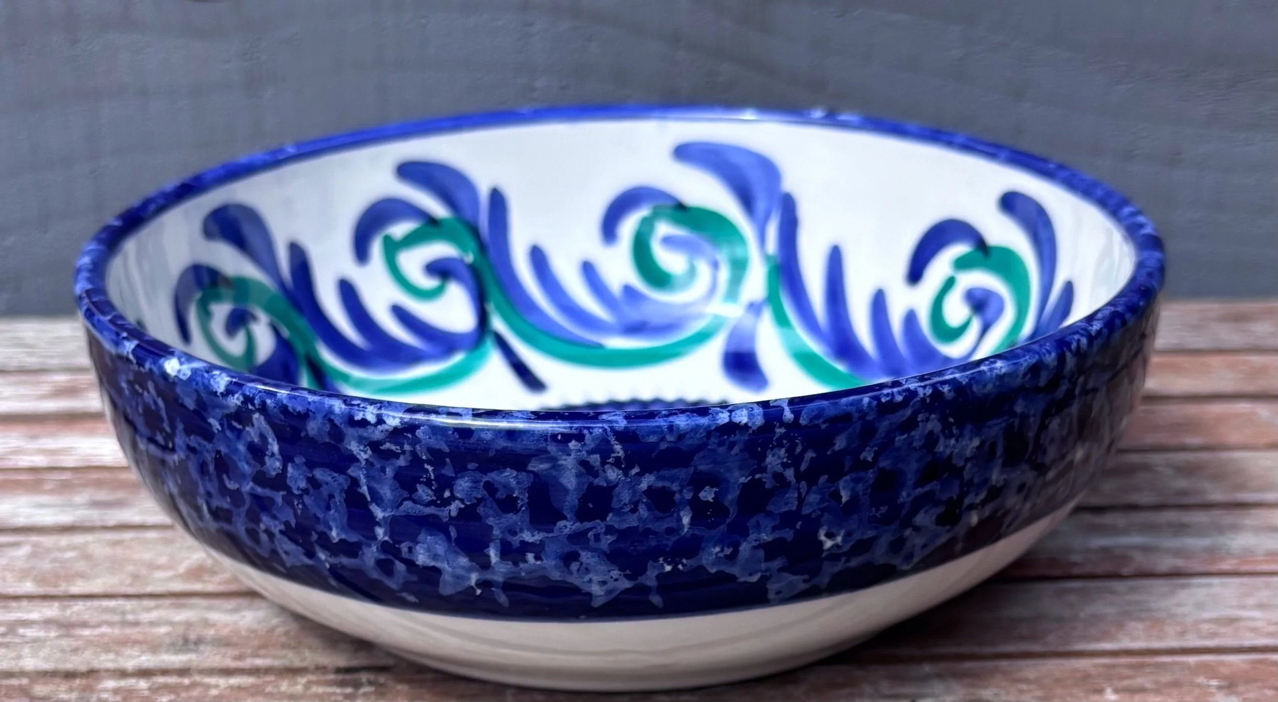 Spanish pottery garlic rasp, ginger, chocolate, nutmeg, tomato, onion, cucumber grater. Green, blue and white ceramic grater bowl