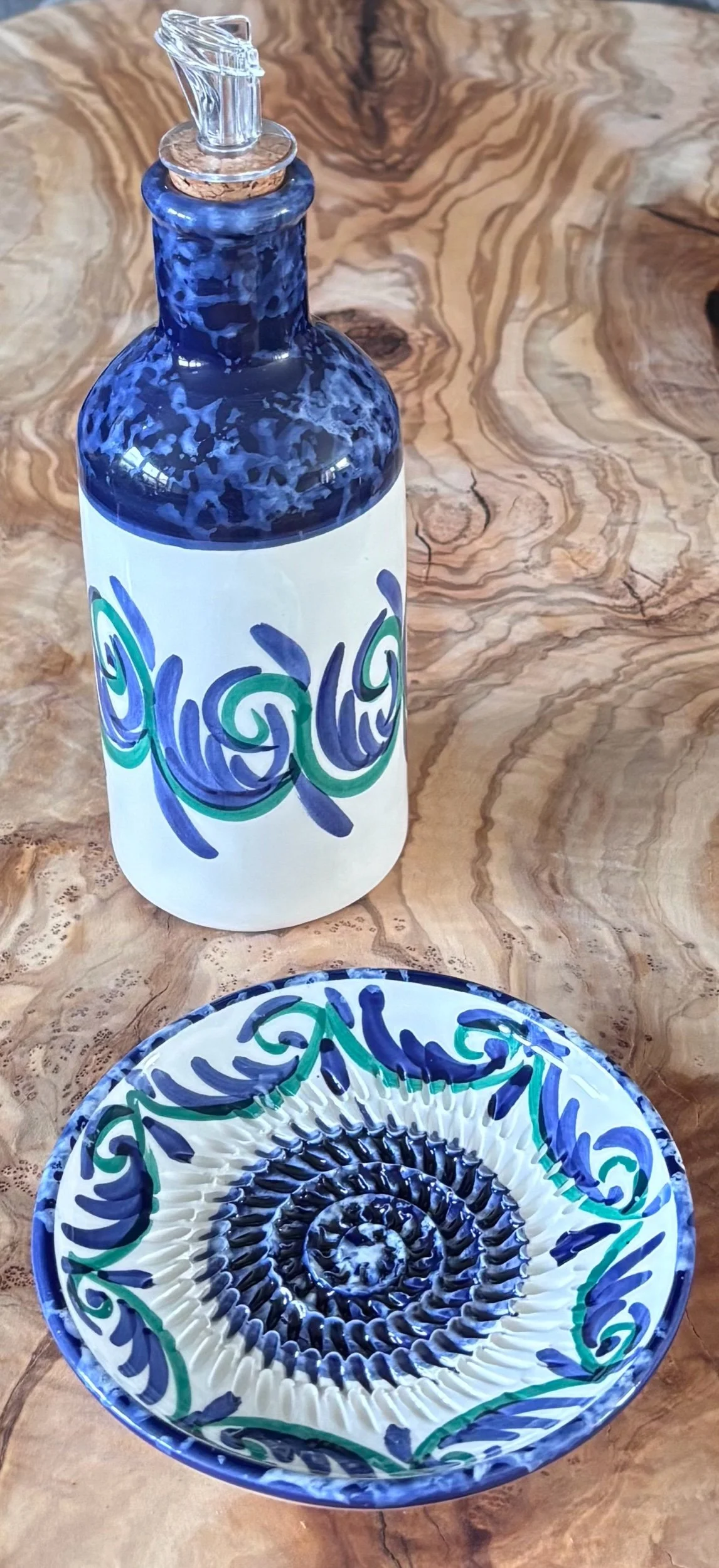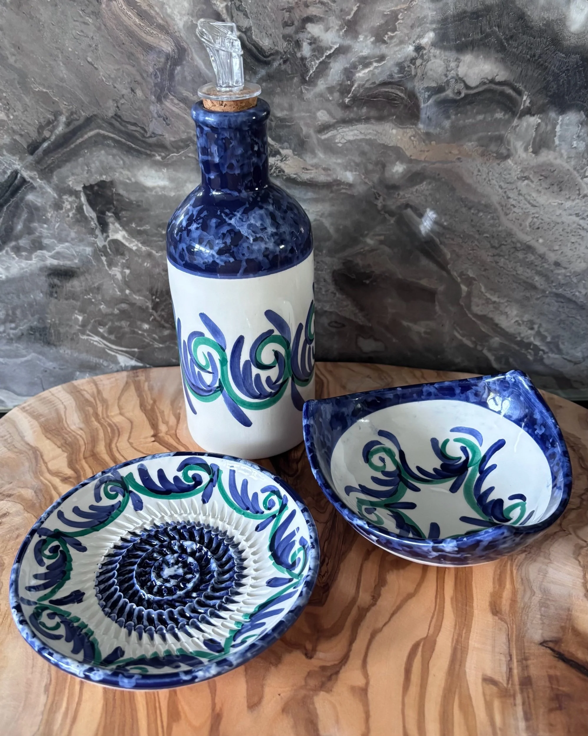 12cm Garlic Grater Plate: Features a textured centre to create fresh garlic or ginger paste in seconds. π§Ceramic Oil Drizzler: A beautiful, functional bottle for your olive oil, complete with a pourer. π§πΊ12cm Three-Corner Snack Bowl: A unique triangular dish perfect for olives, nuts, dips, or holding your dipping bread. ππ«