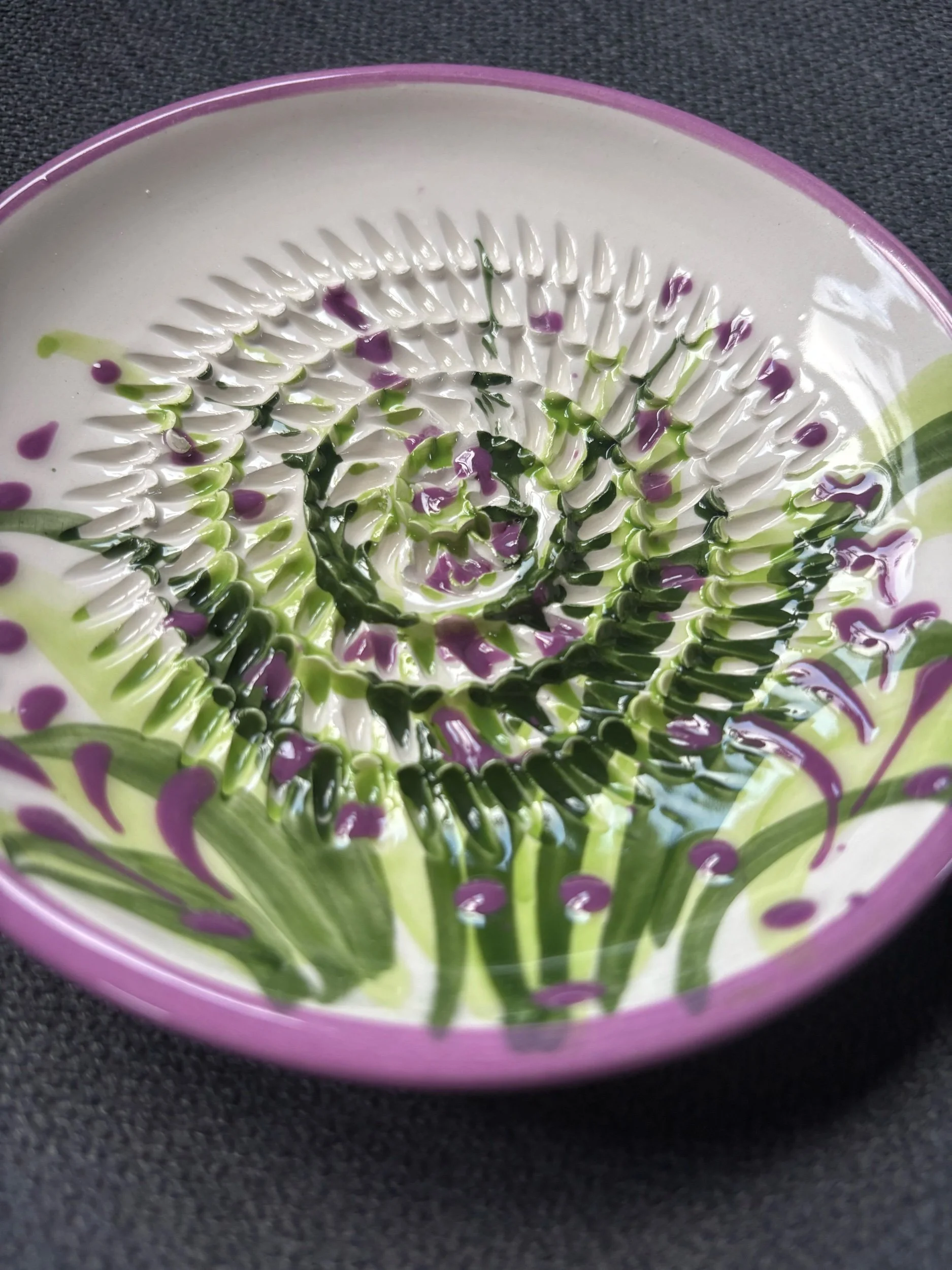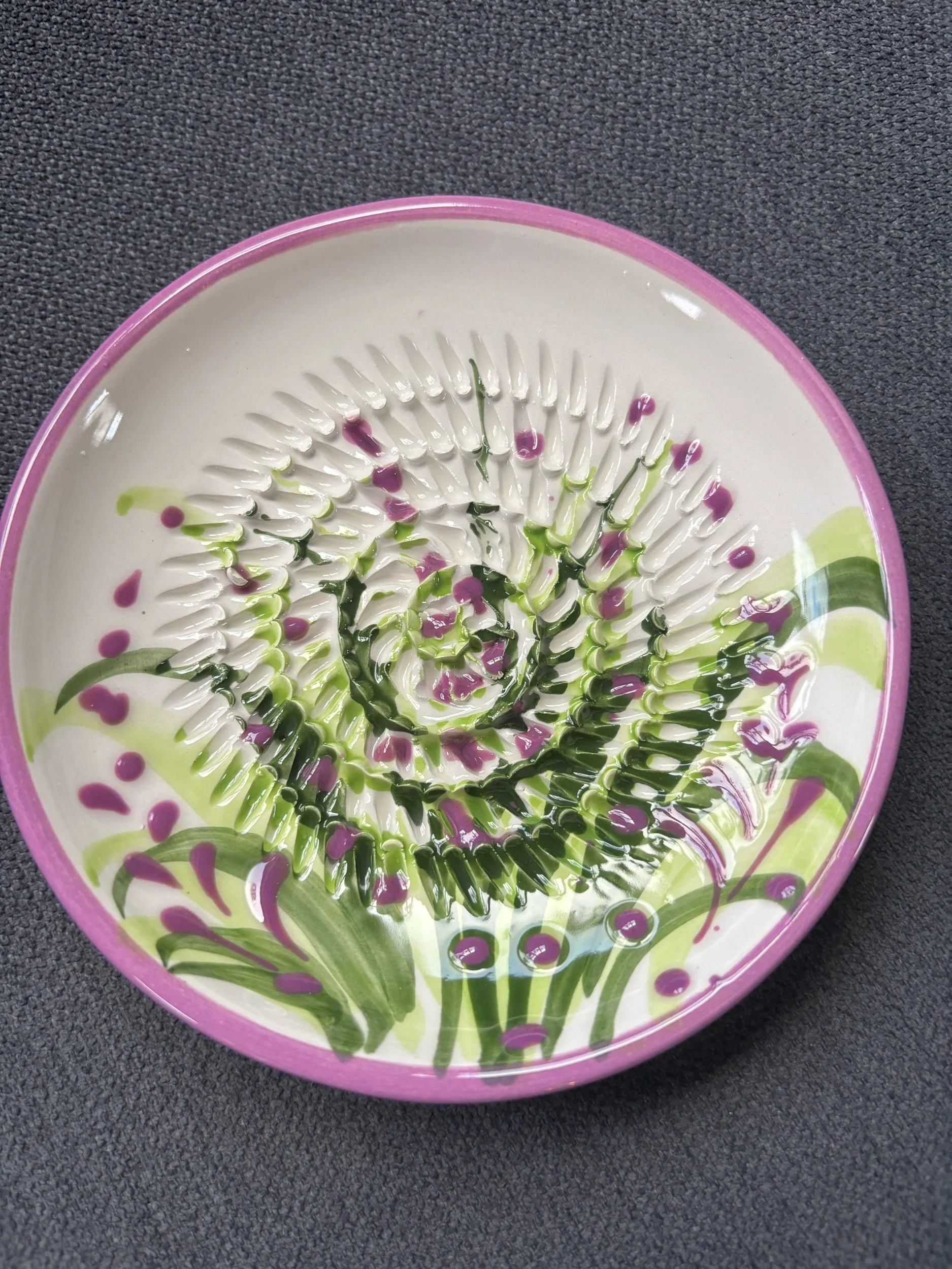 This is a stunning floral garlic rasp or ginger grater. It was made in the south of Spain and measures 12 cm across. It is dishwasher and microwave safe. We have it in 6 colours and we also have matching other kitchen items. Please feel free to message us if you have any questions.