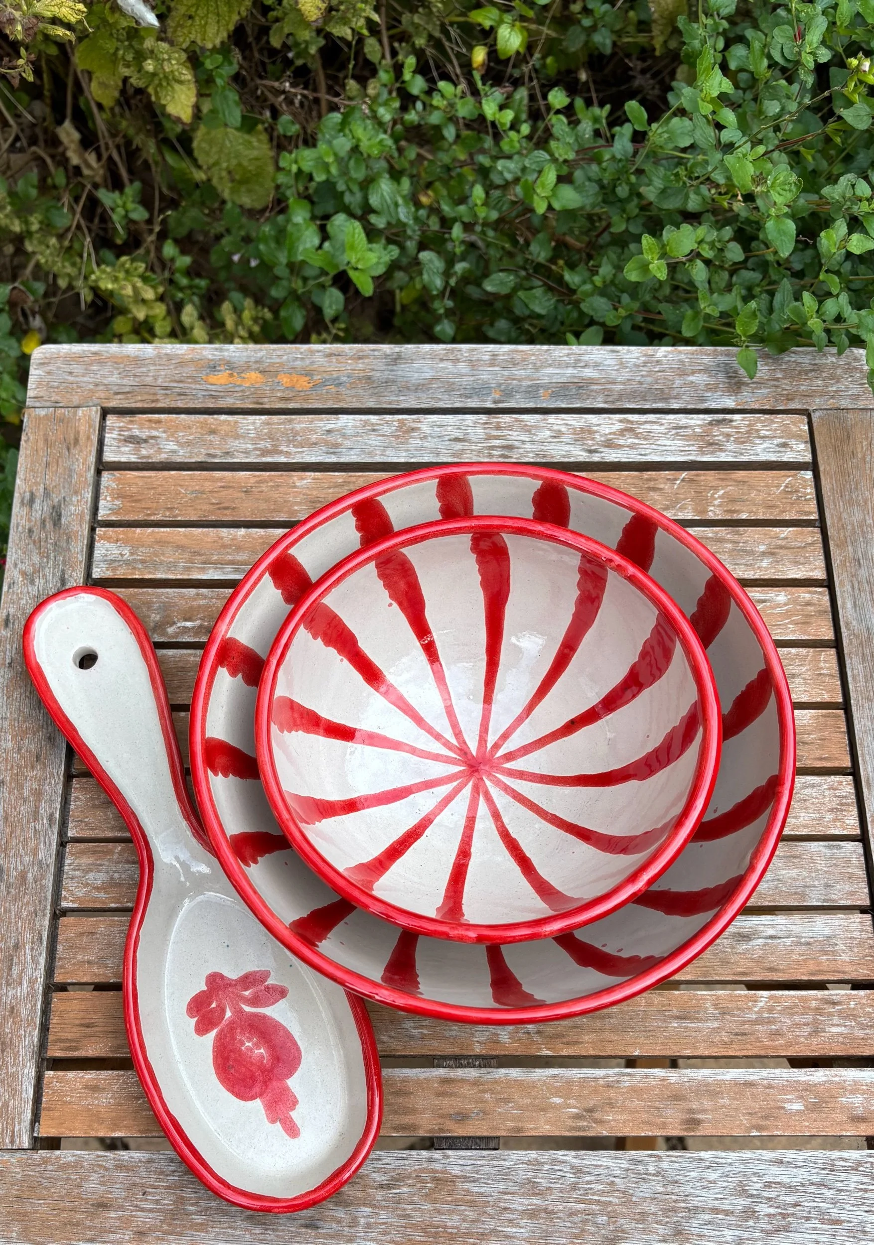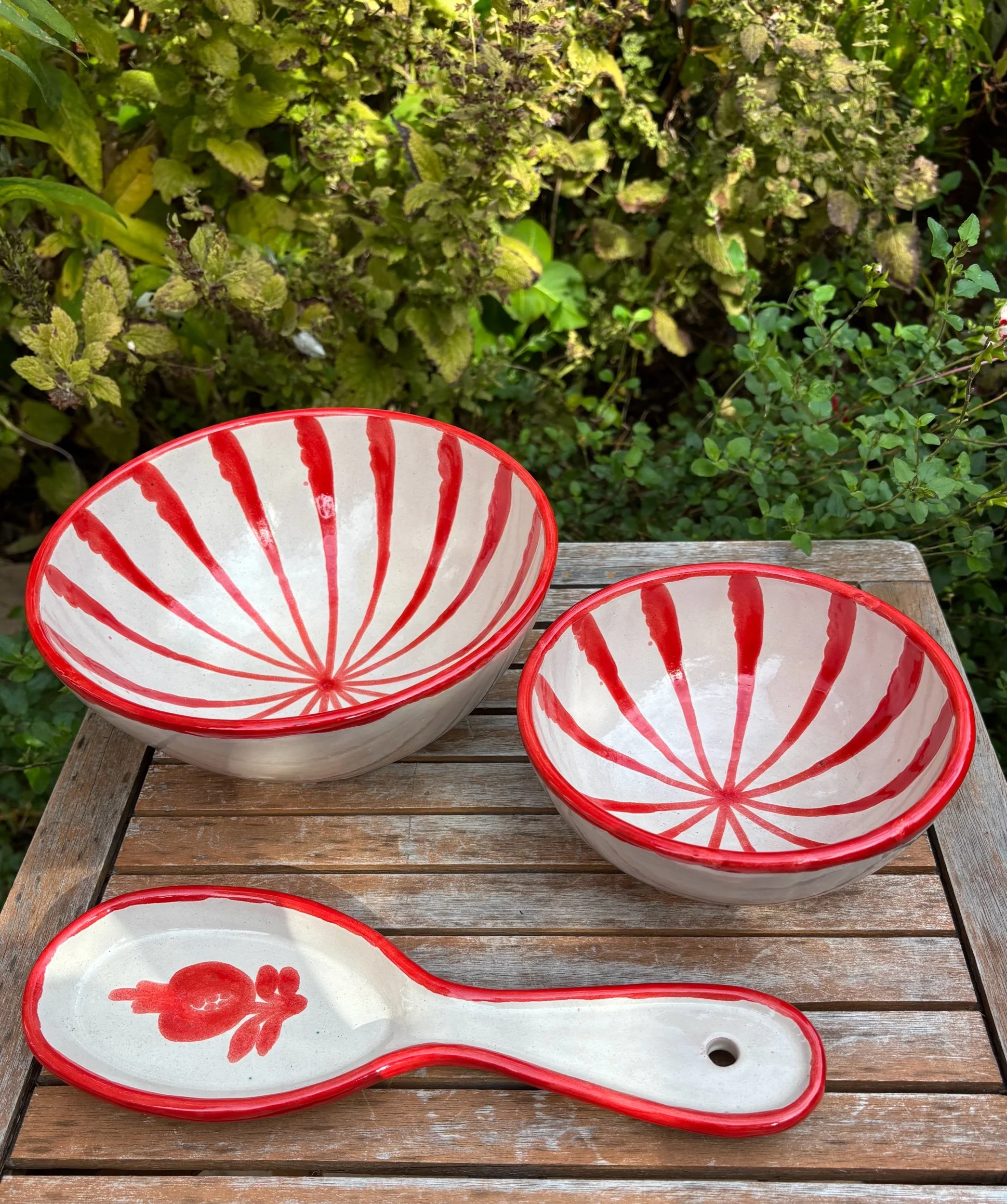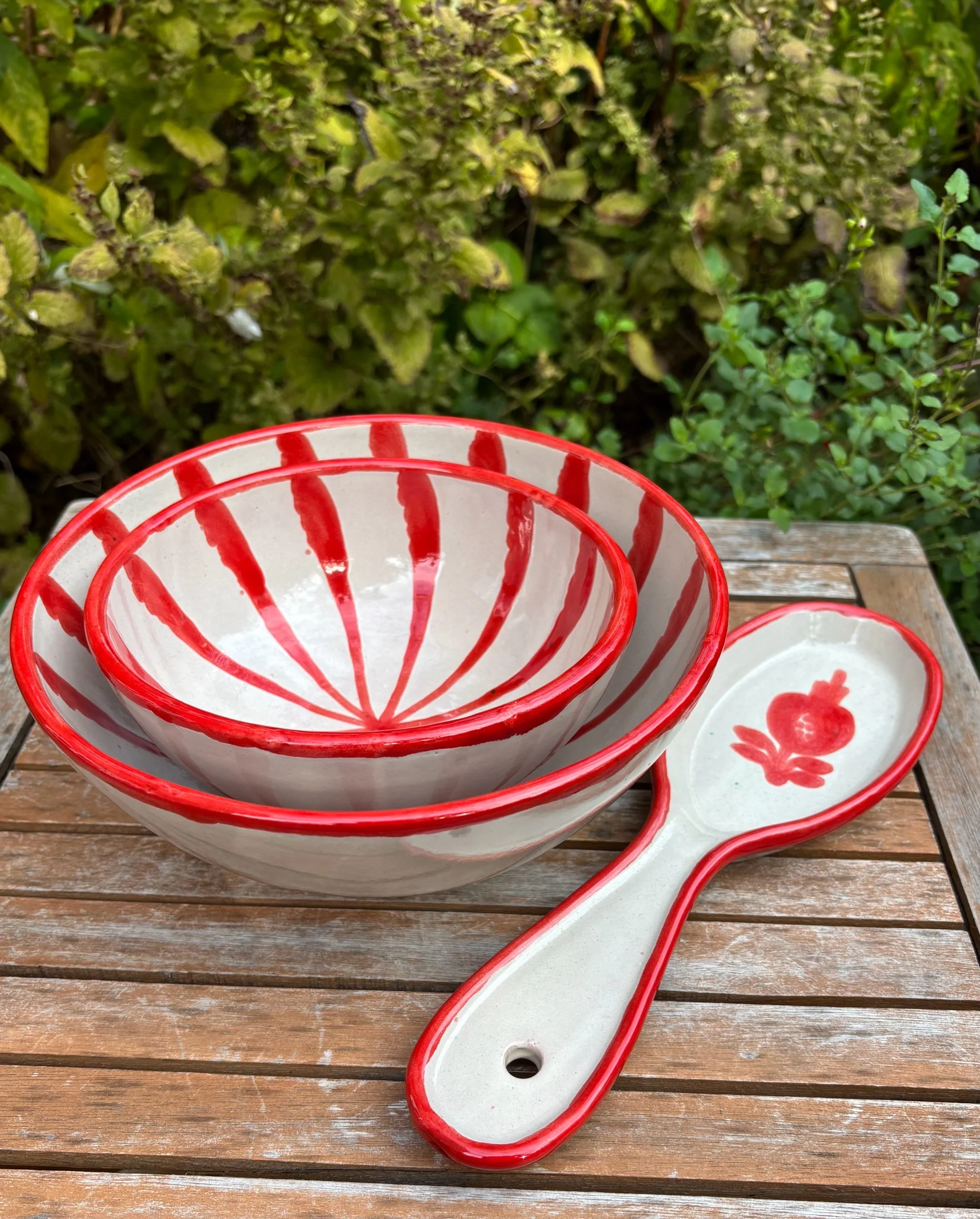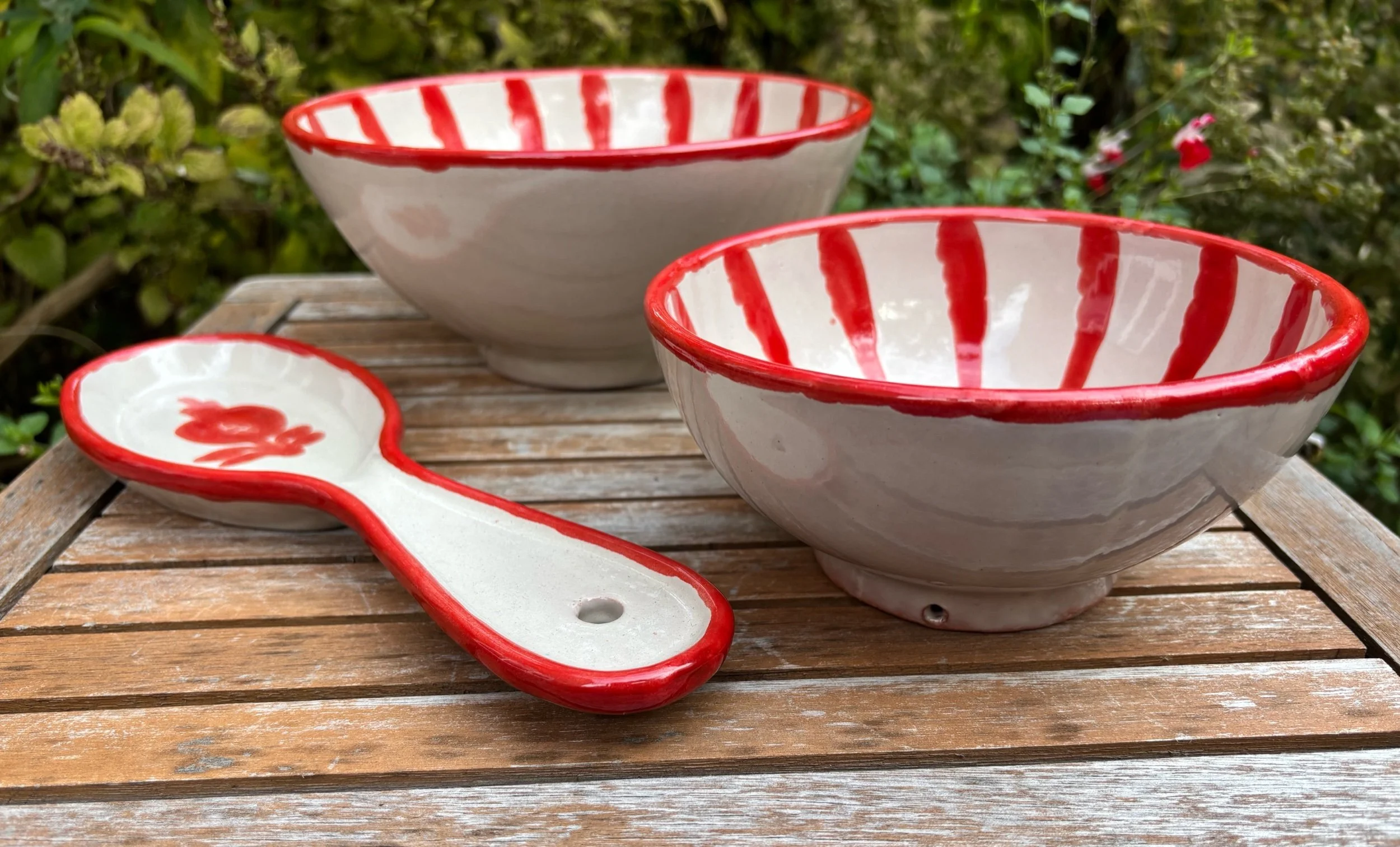 Two handpainted and handmade red and cream bowls and matching spoon rest.