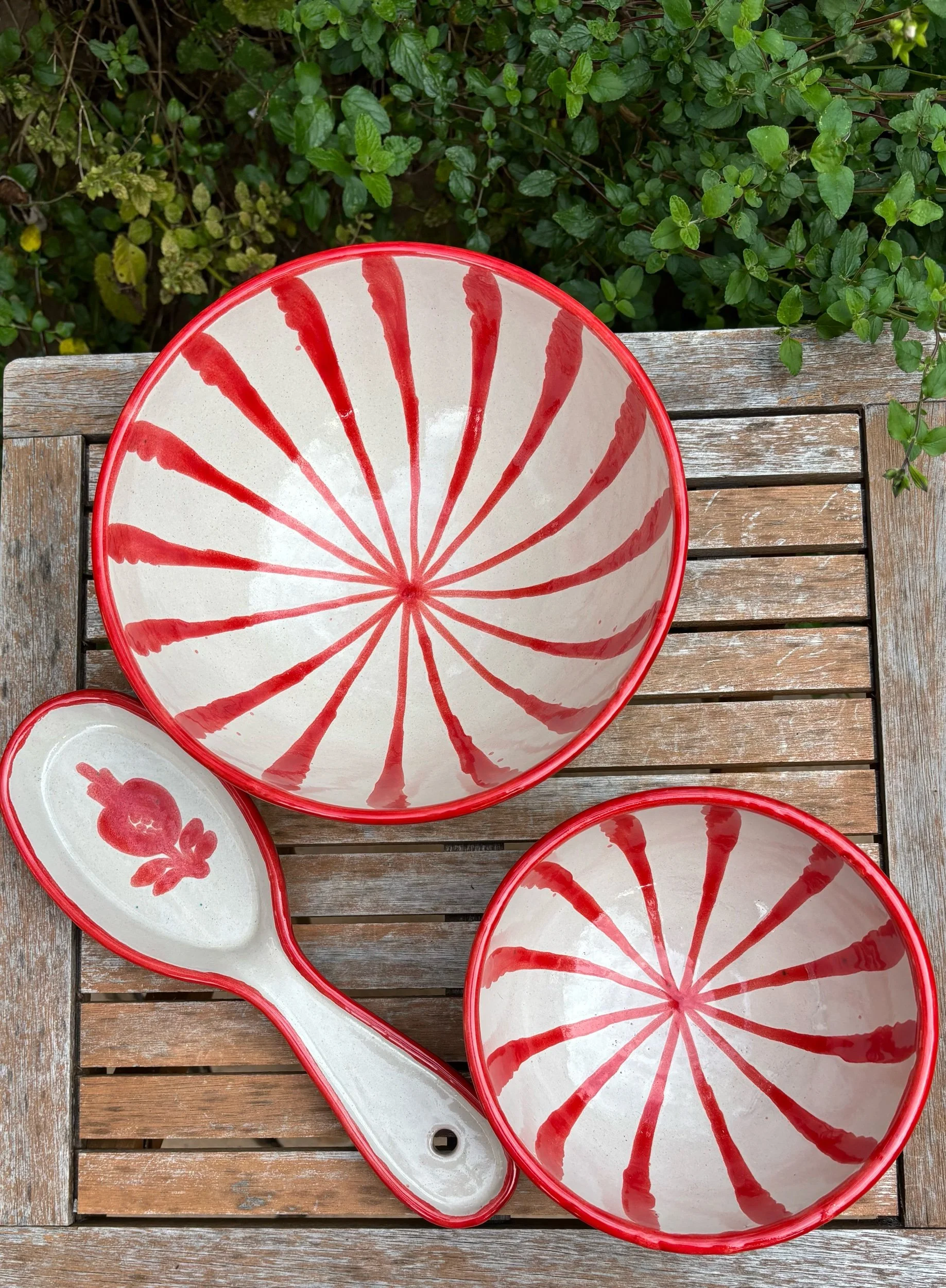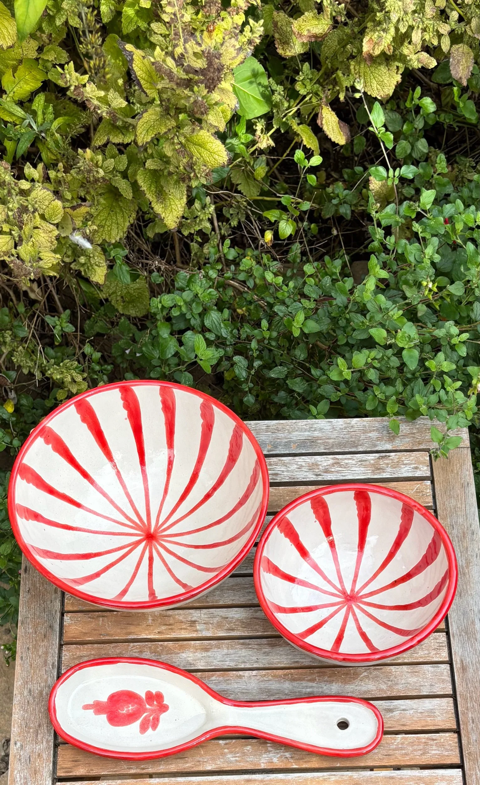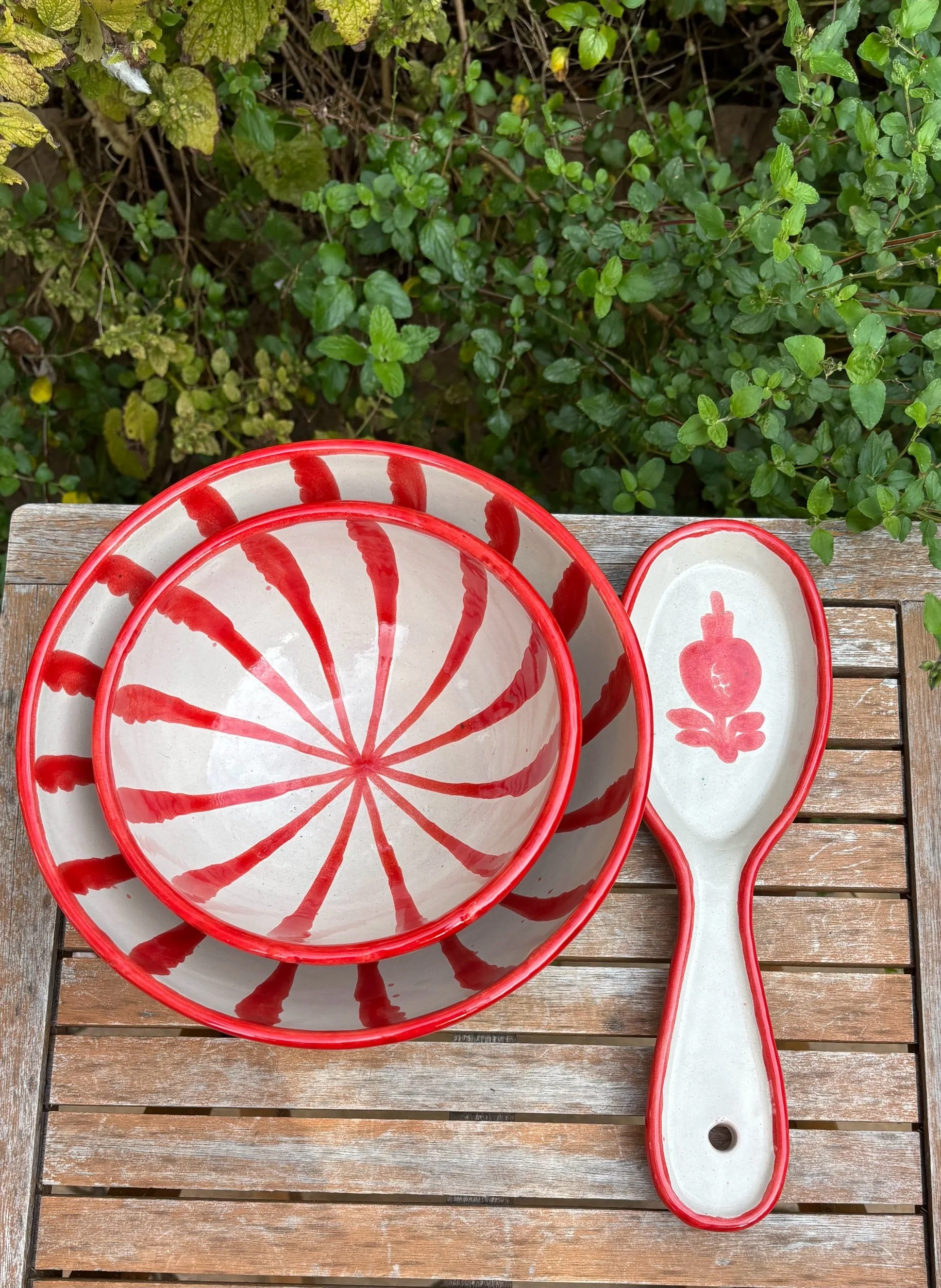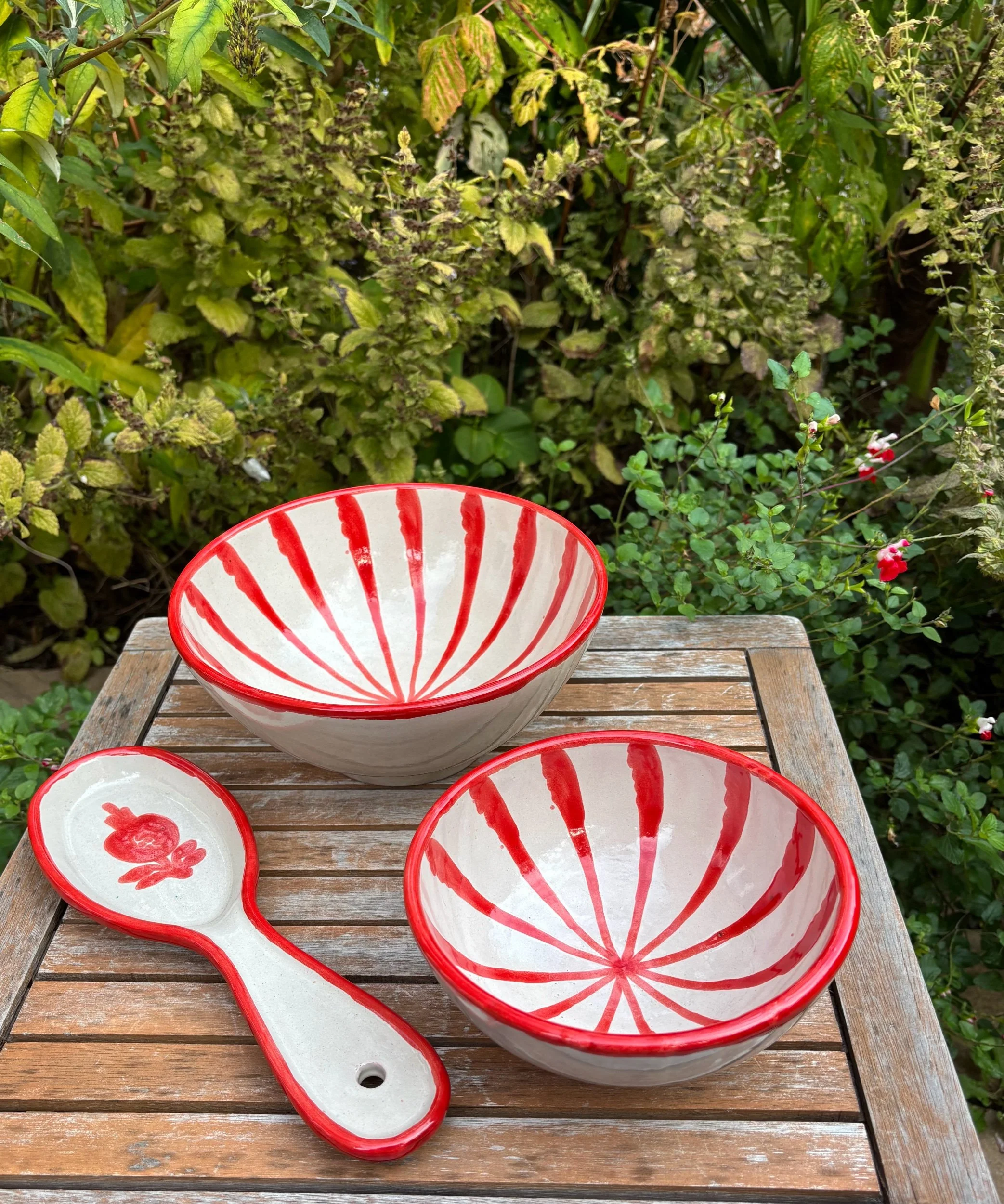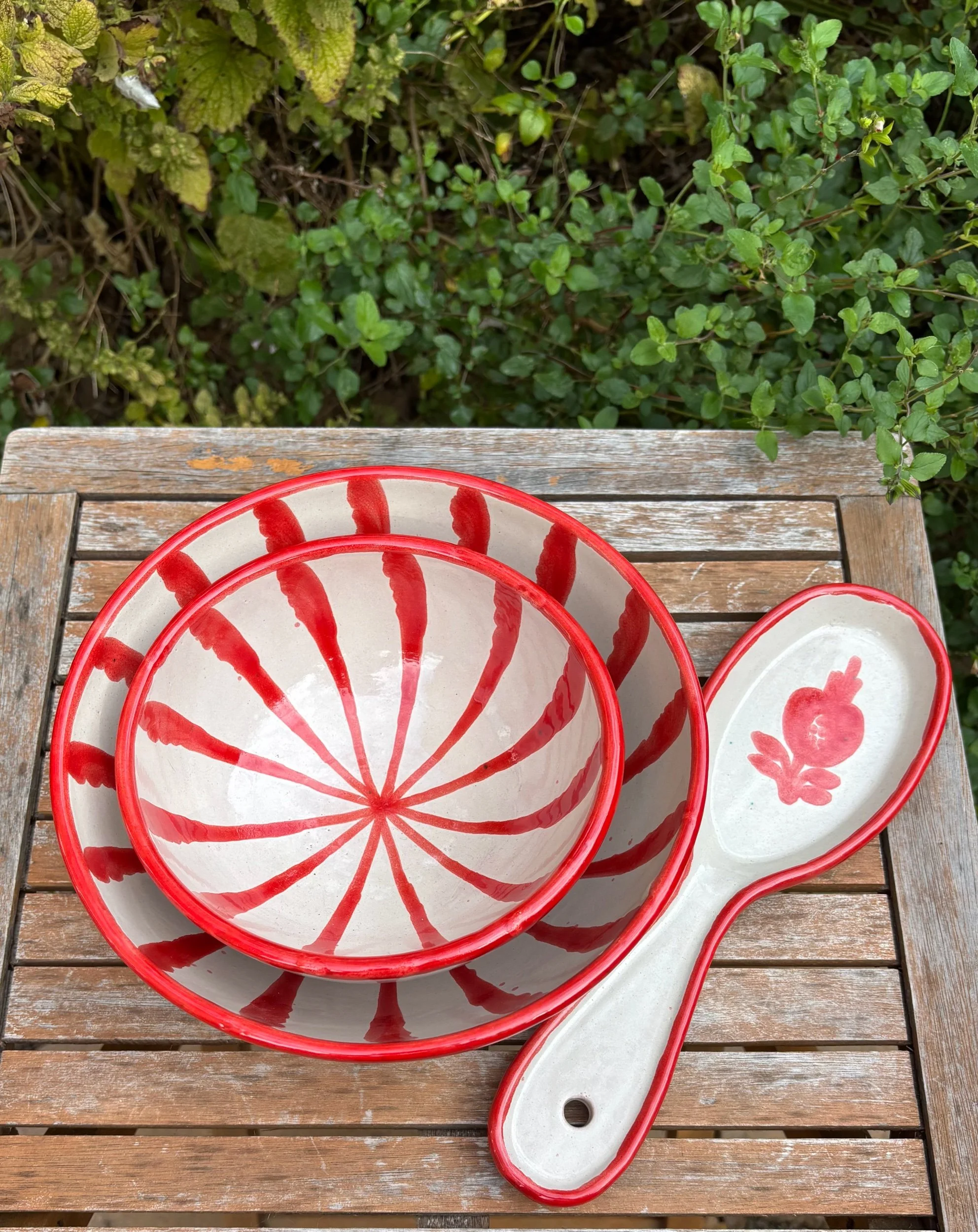 Two handpainted and handmade red and cream bowls and matching spoon rest.