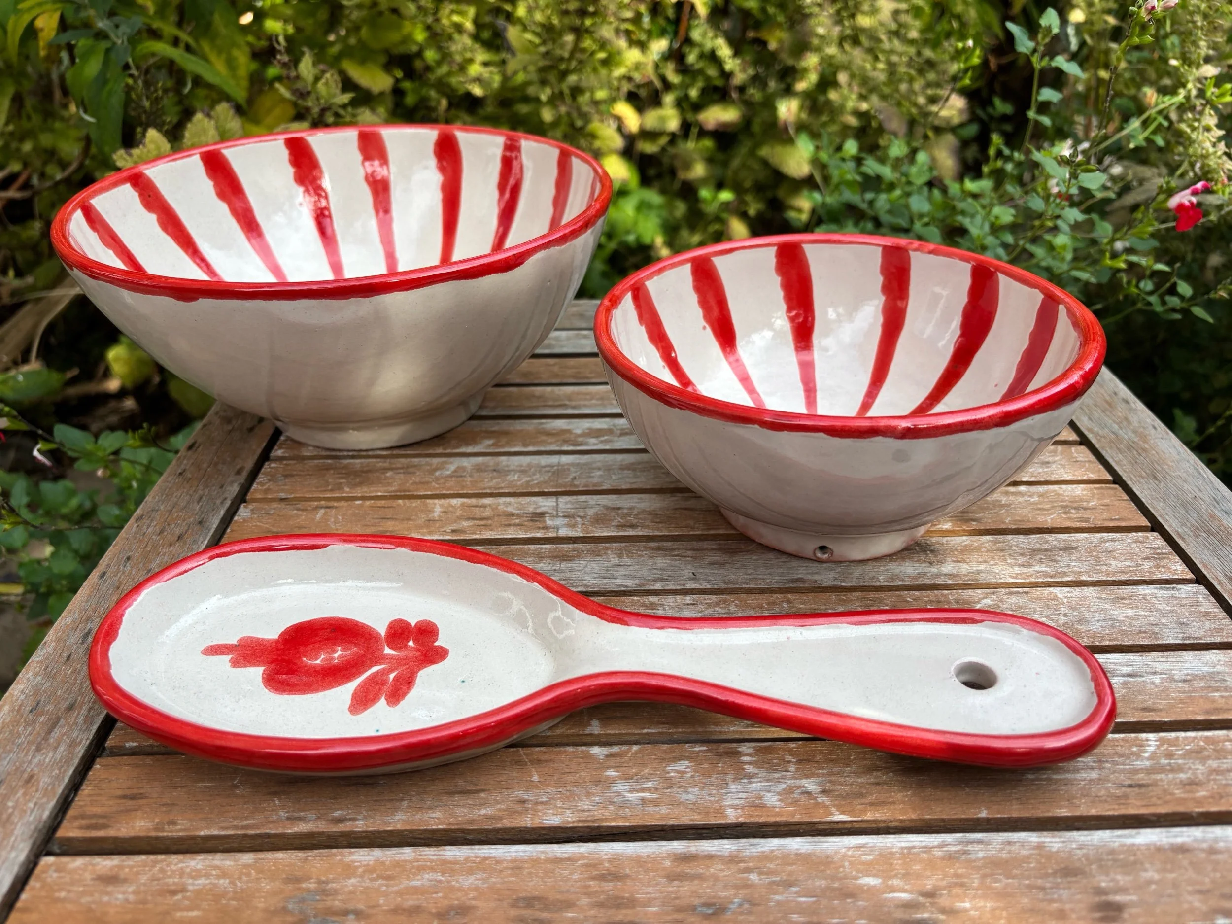 Spanish pottery dishes and matching spoon rest - two hand painted red and cream snack bowls and trivet