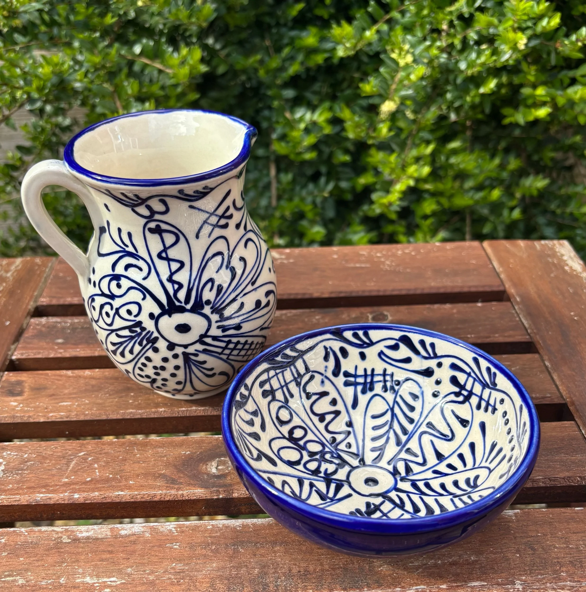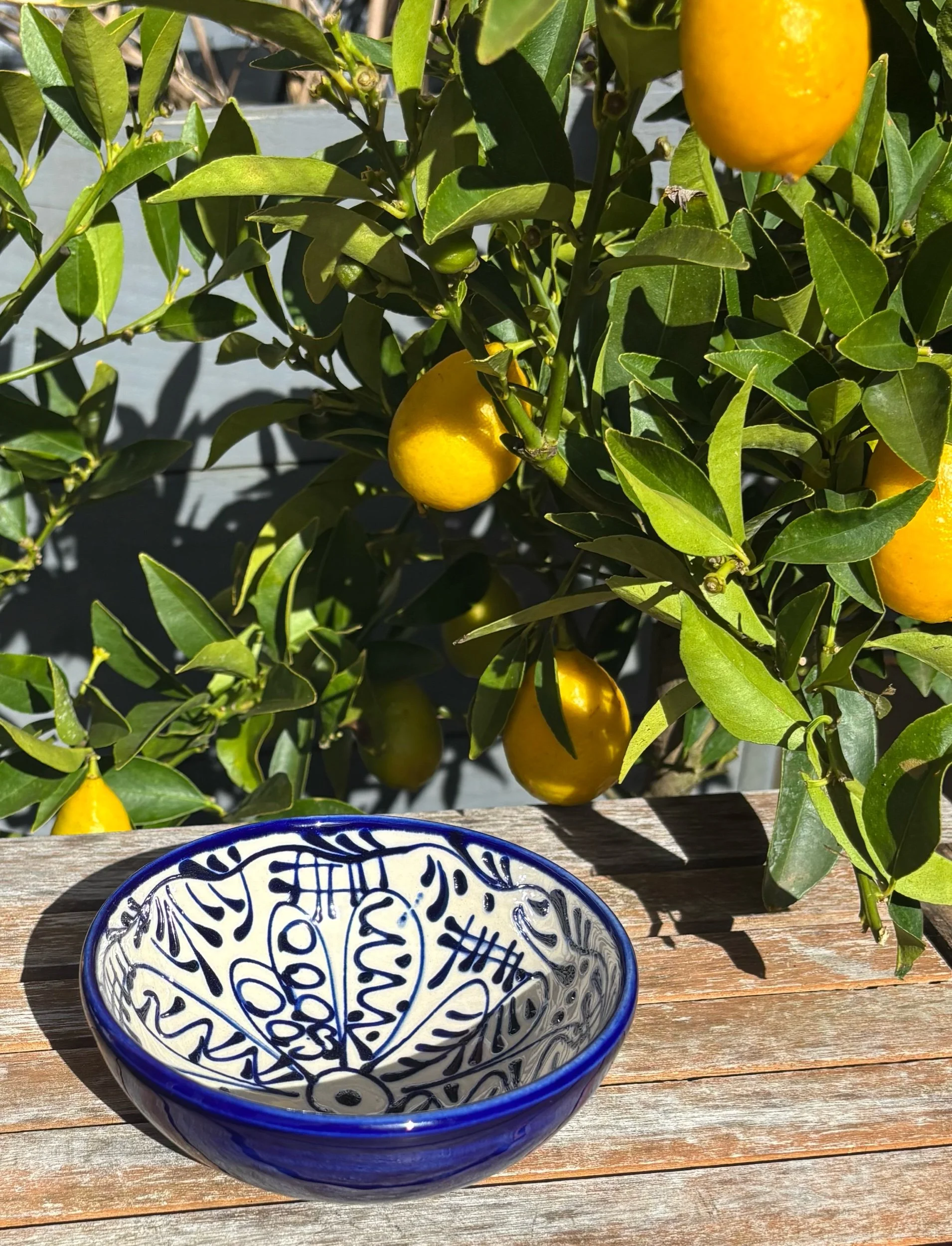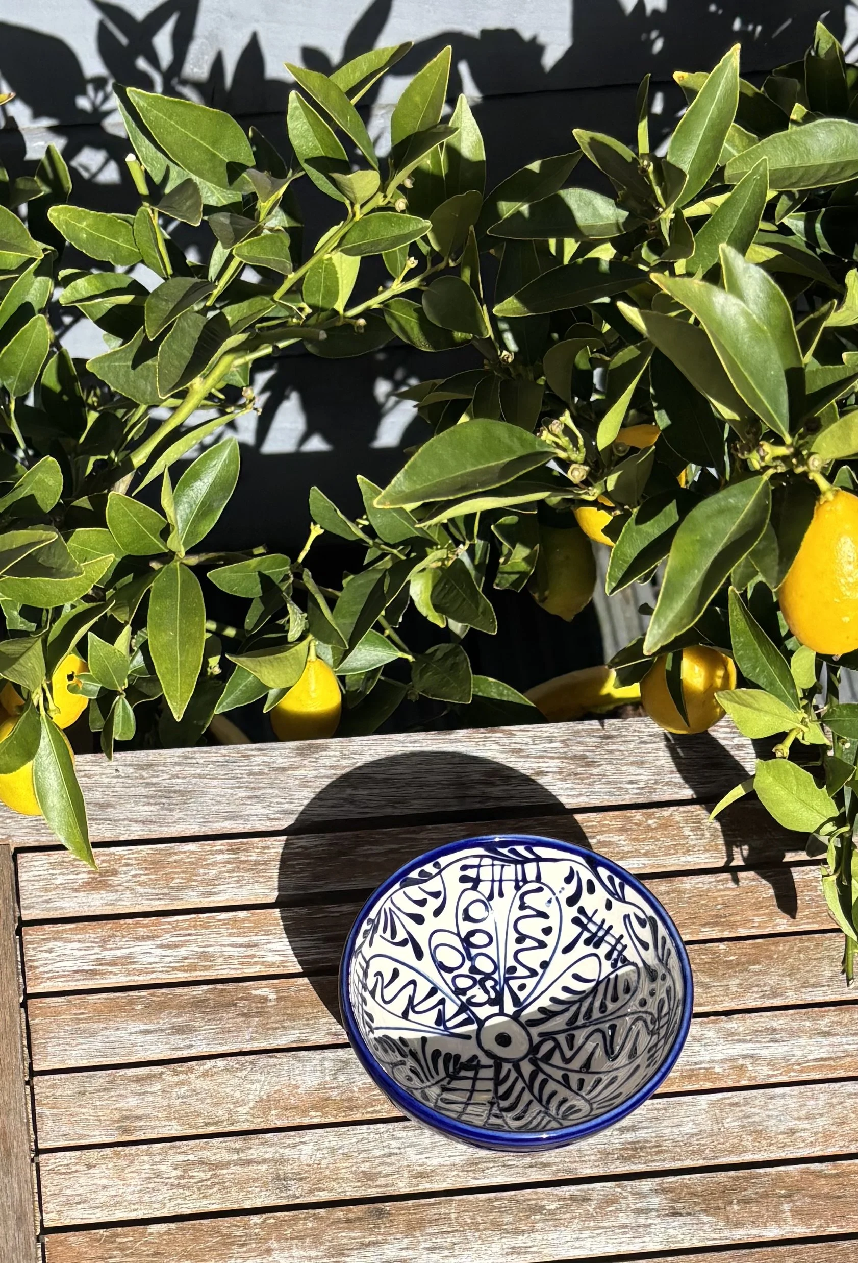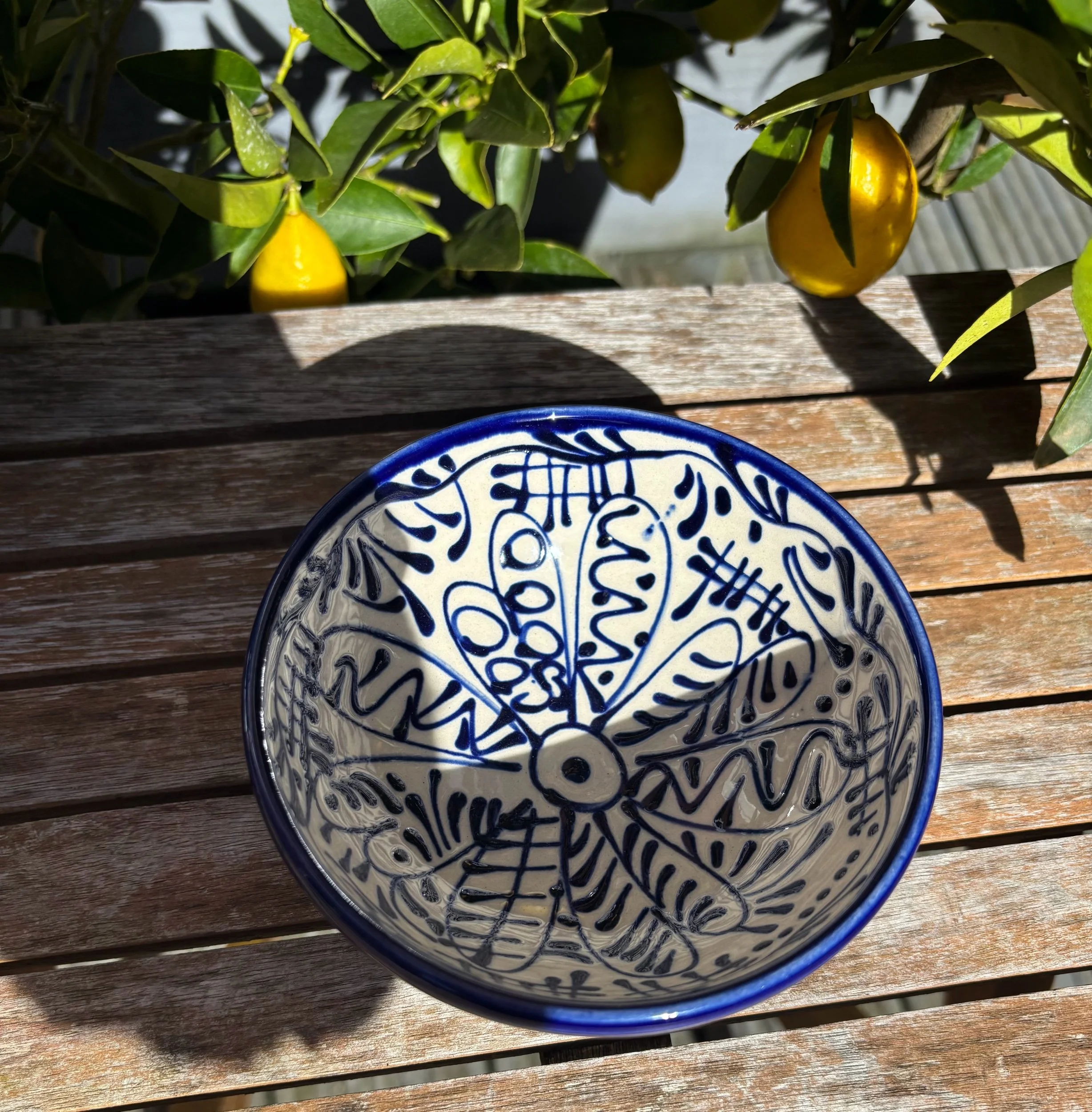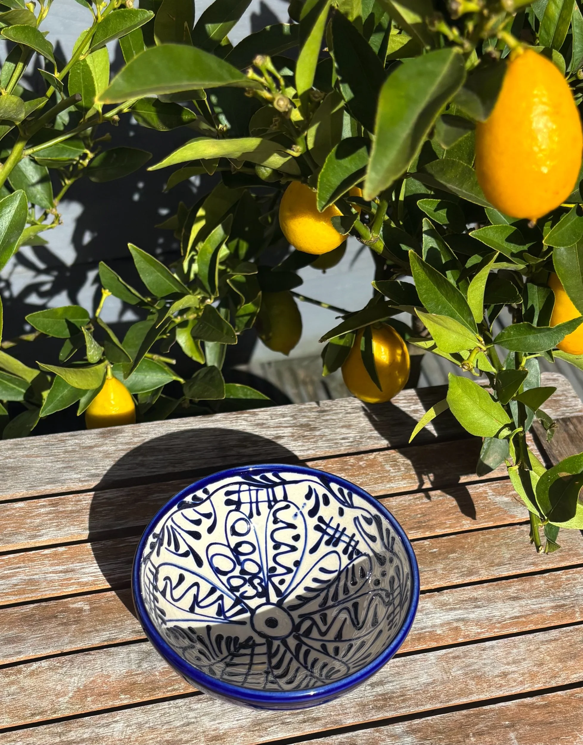 Small hand-painted blue and white floral-themed Spanish pottery round snack bowl