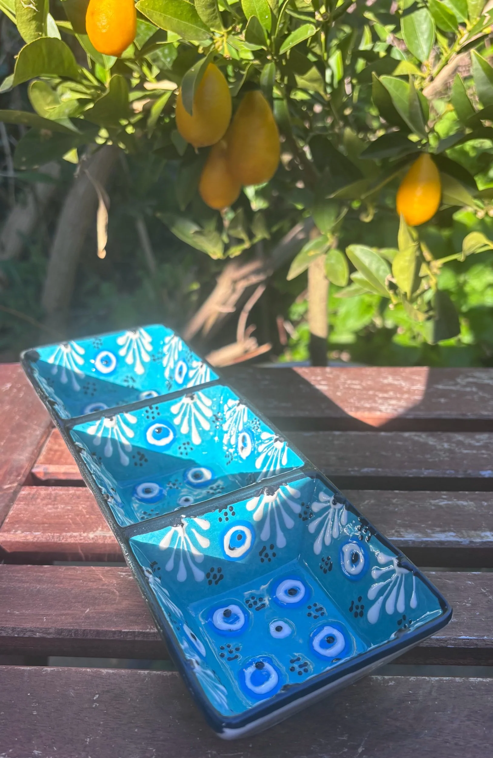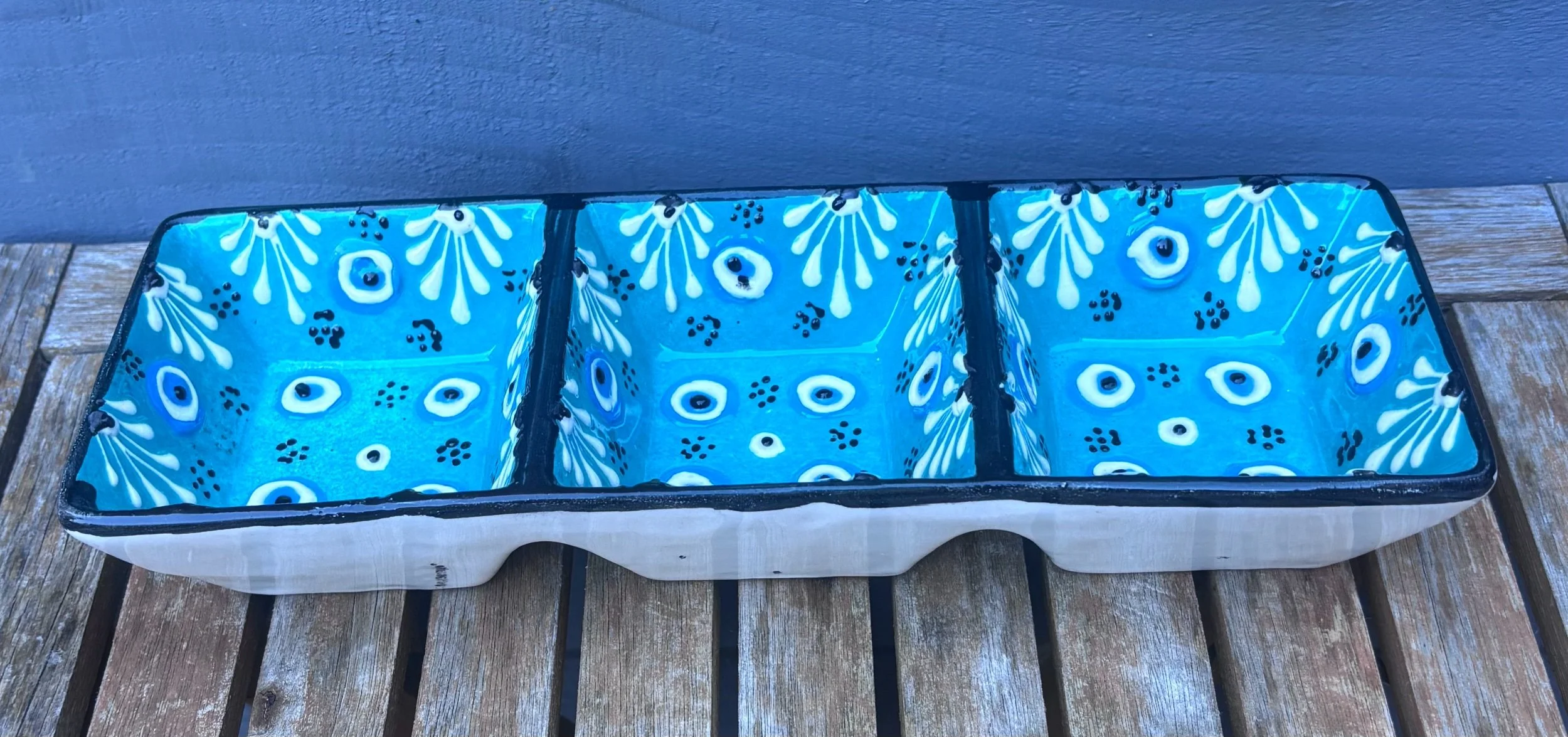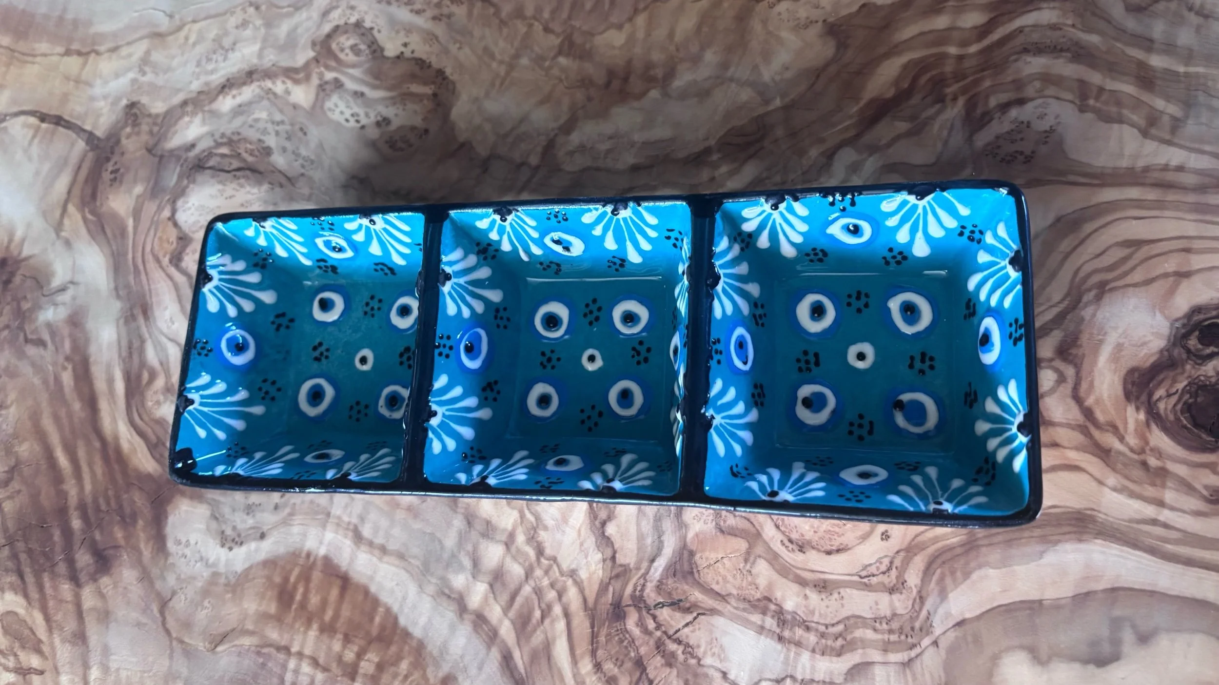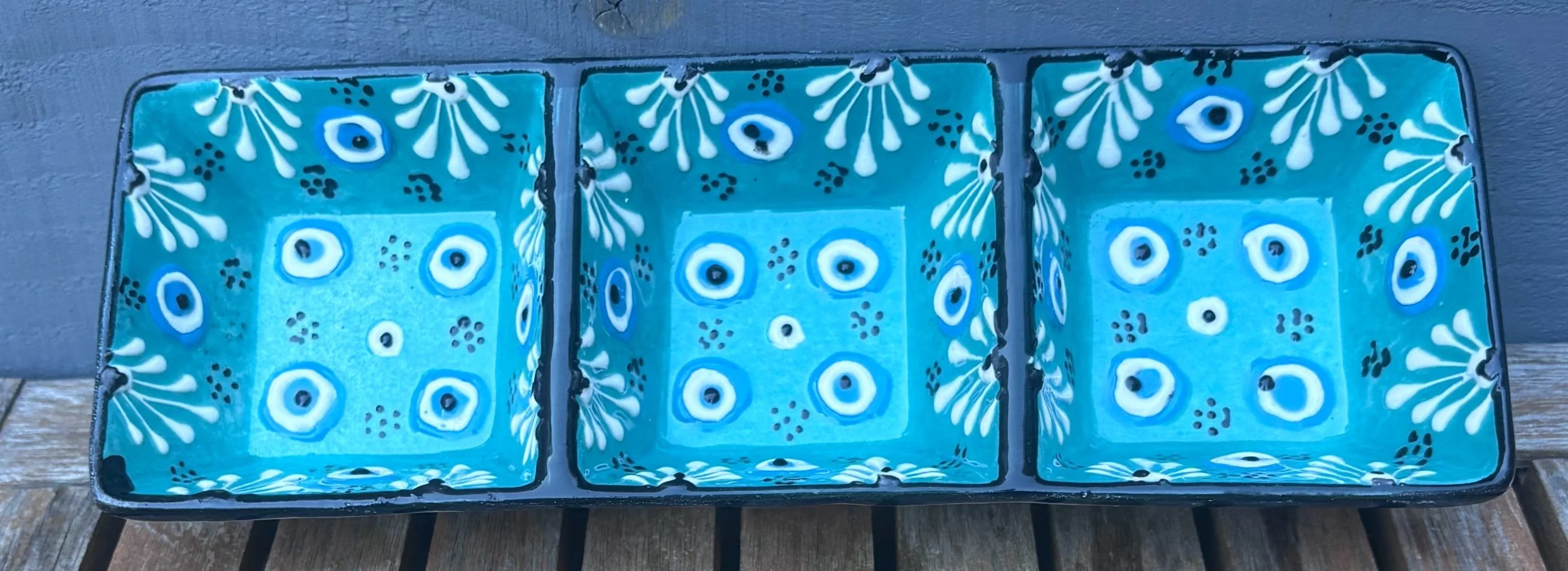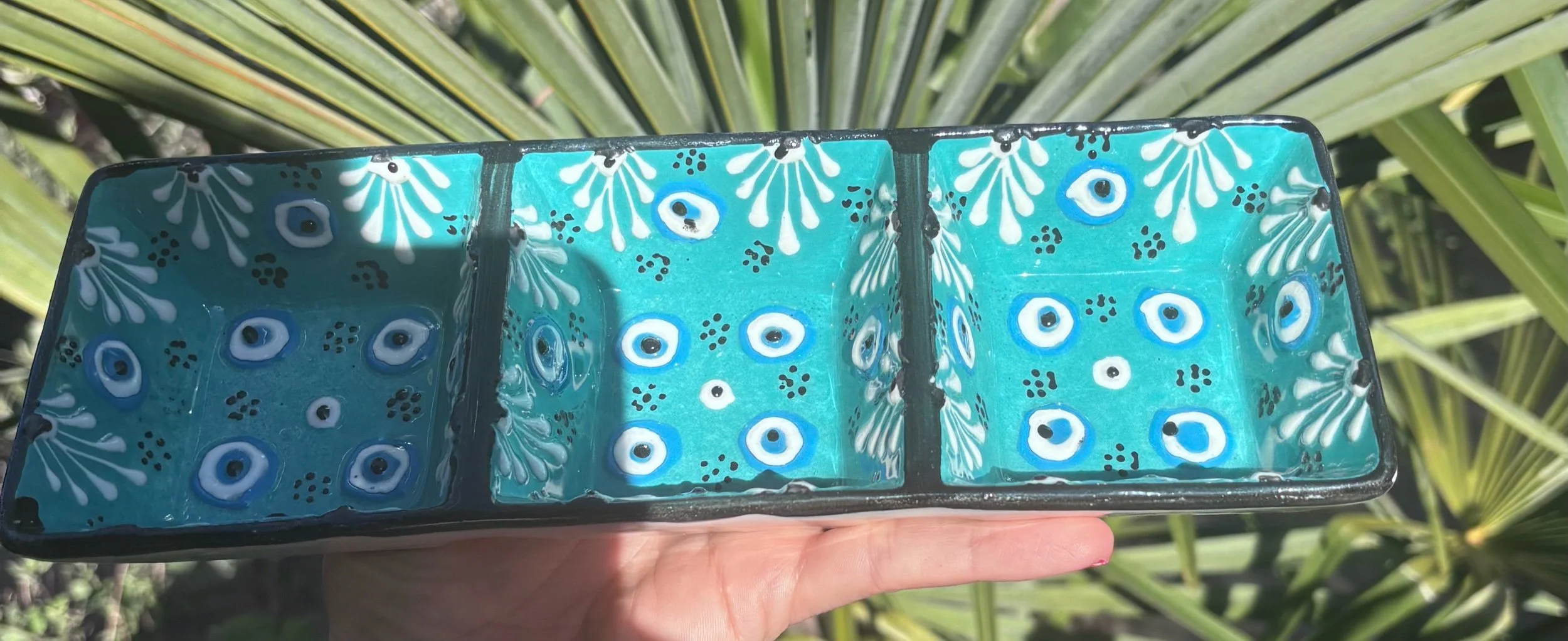 This beautiful three-compartment snack bowl is the perfect way to bring the spirit of the Greek Isles to your table. Hand-painted with a turquoise background and accented with white "Evil Eye" (Mati) motifs, itβs designed to protect your home from bad energy while keeping your guests well-fed! ππ₯¨