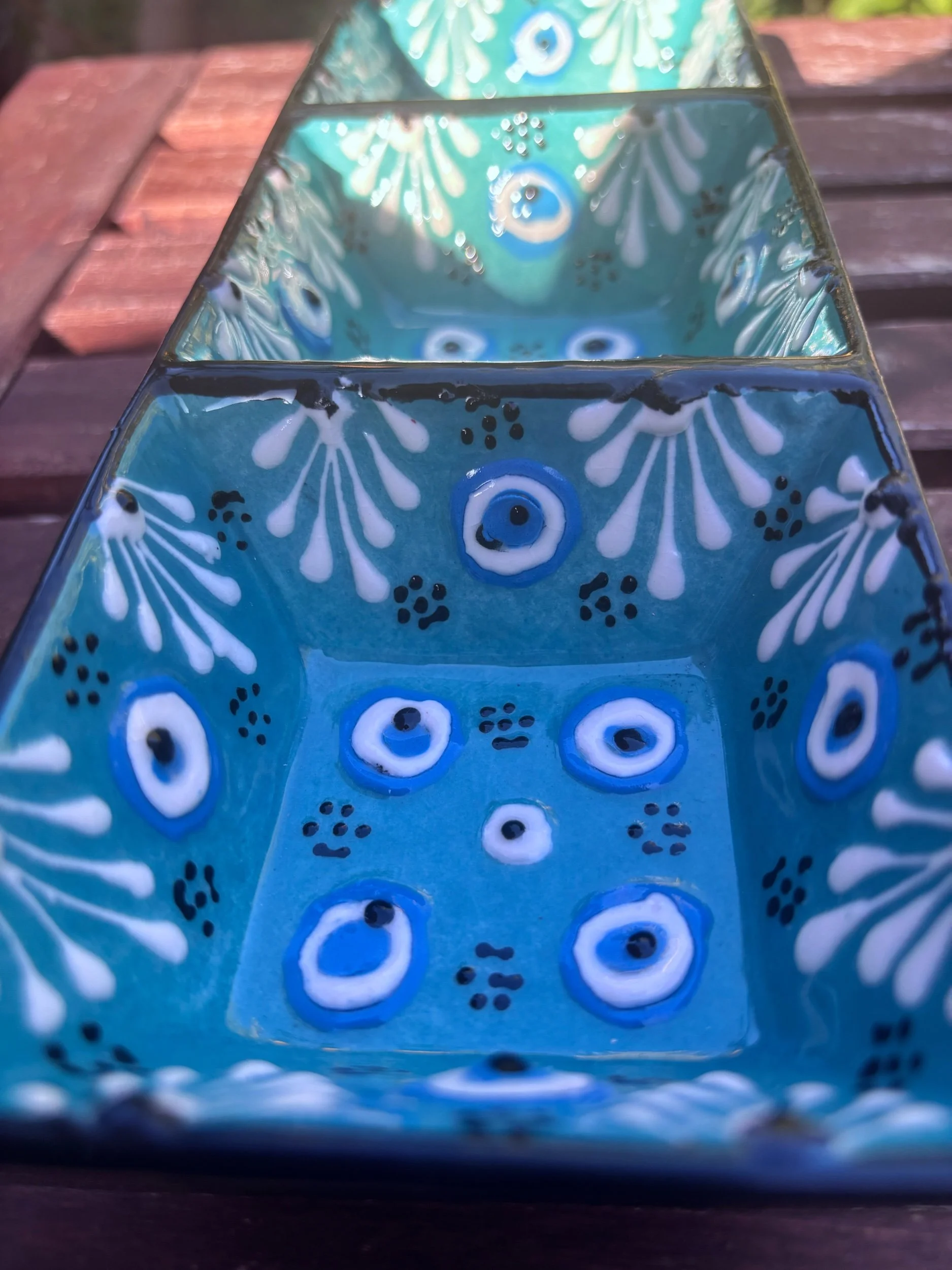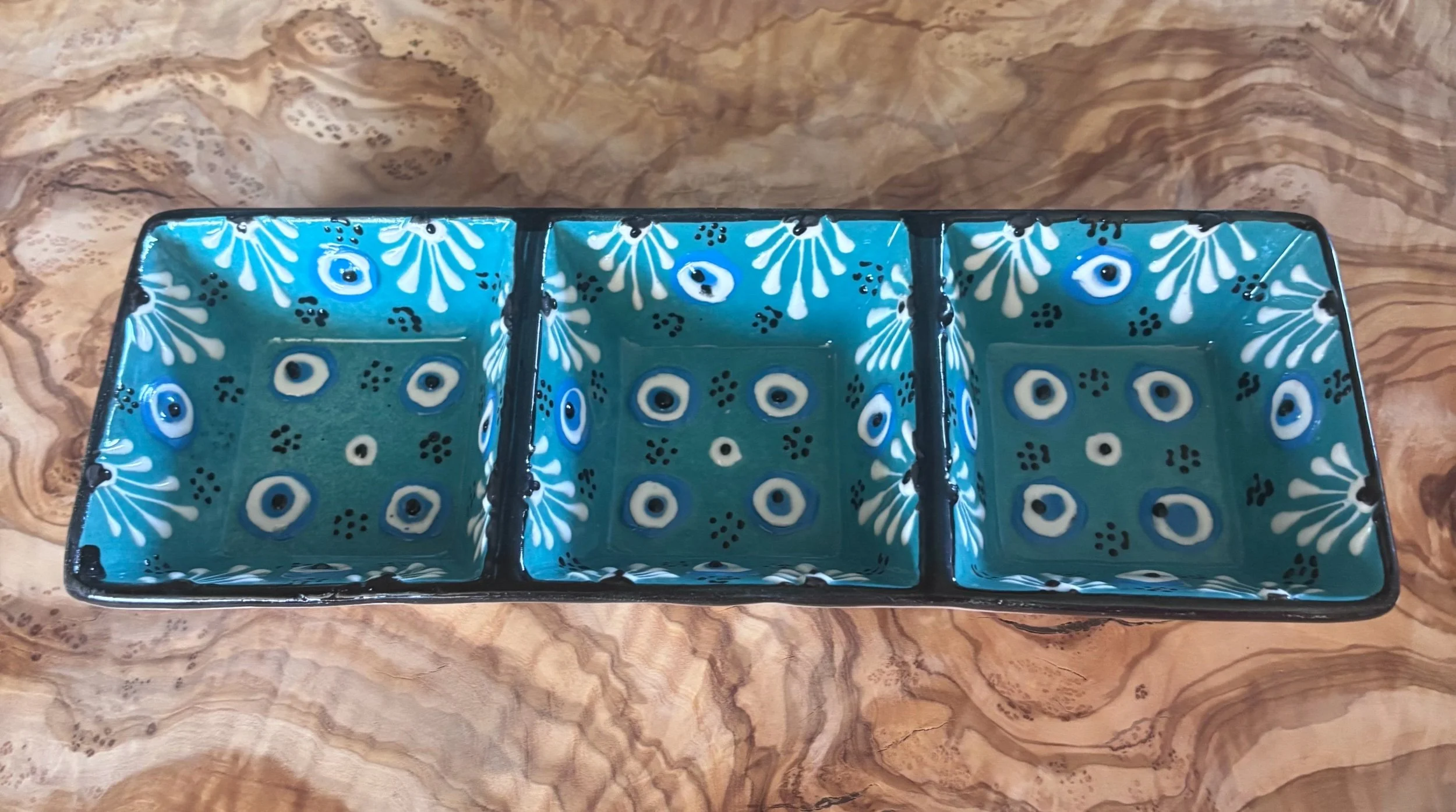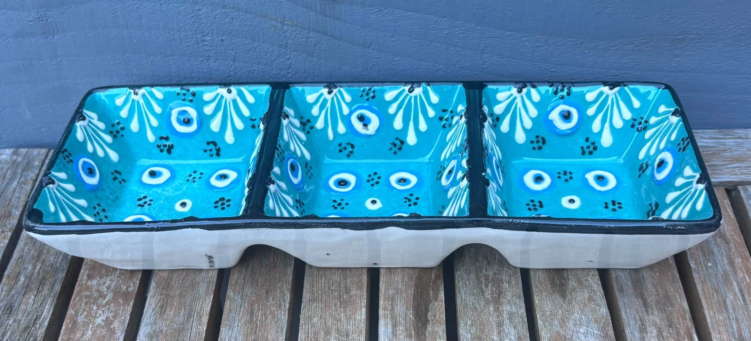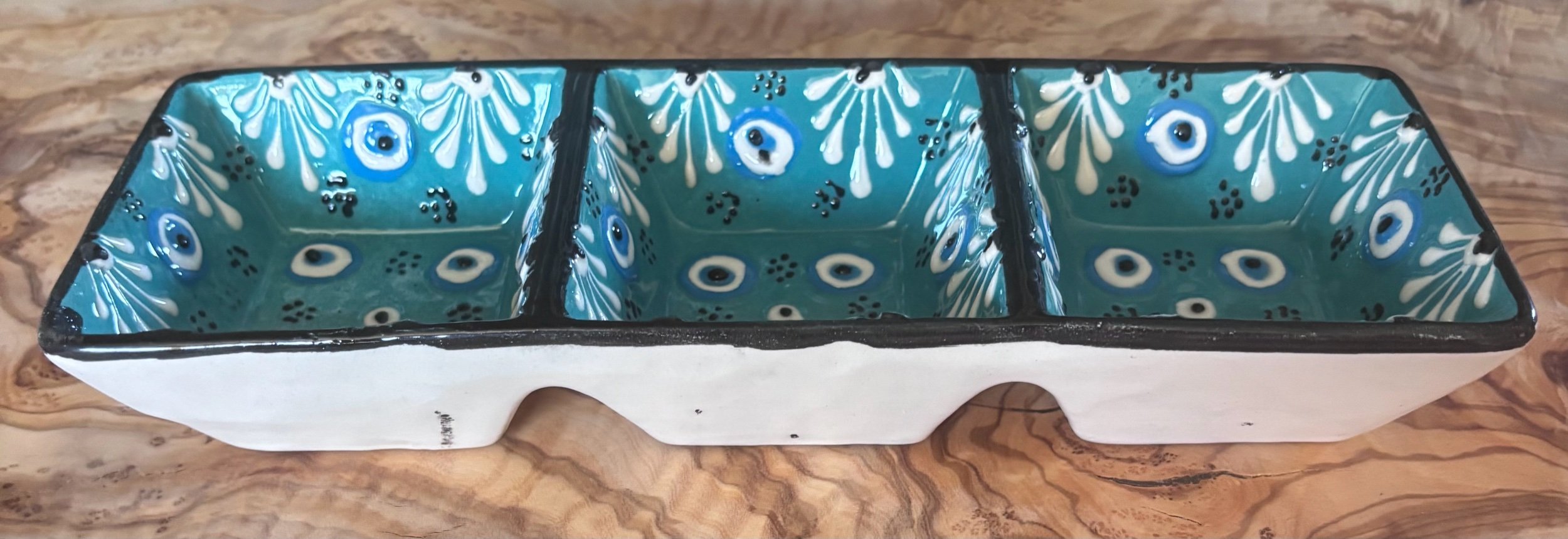 This beautiful three-compartment snack bowl is the perfect way to bring the spirit of the Greek Isles to your table. Hand-painted with a turquoise background and accented with white "Evil Eye" (Mati) motifs, itβs designed to protect your home from bad energy while keeping your guests well-fed! ππ₯¨