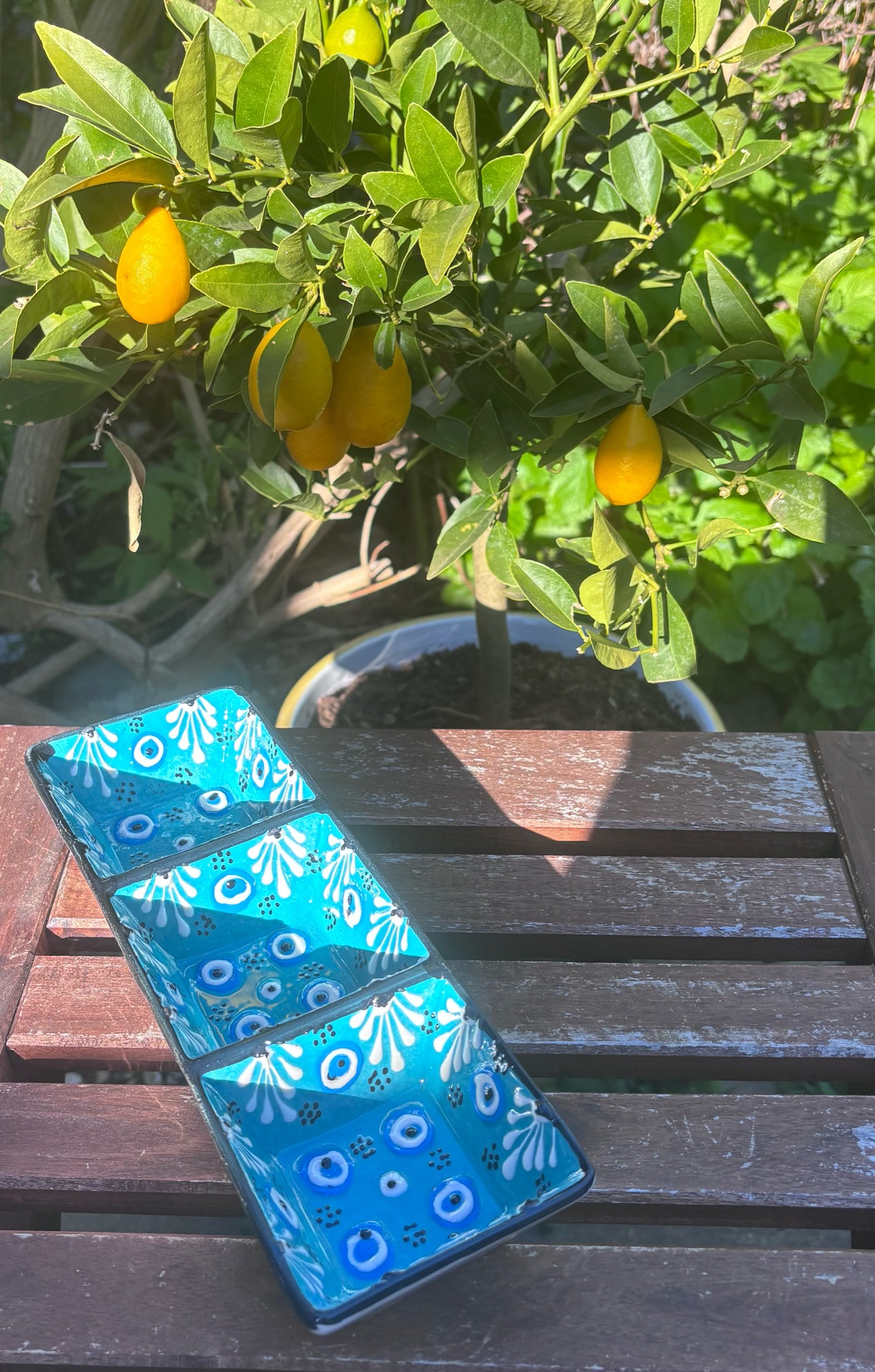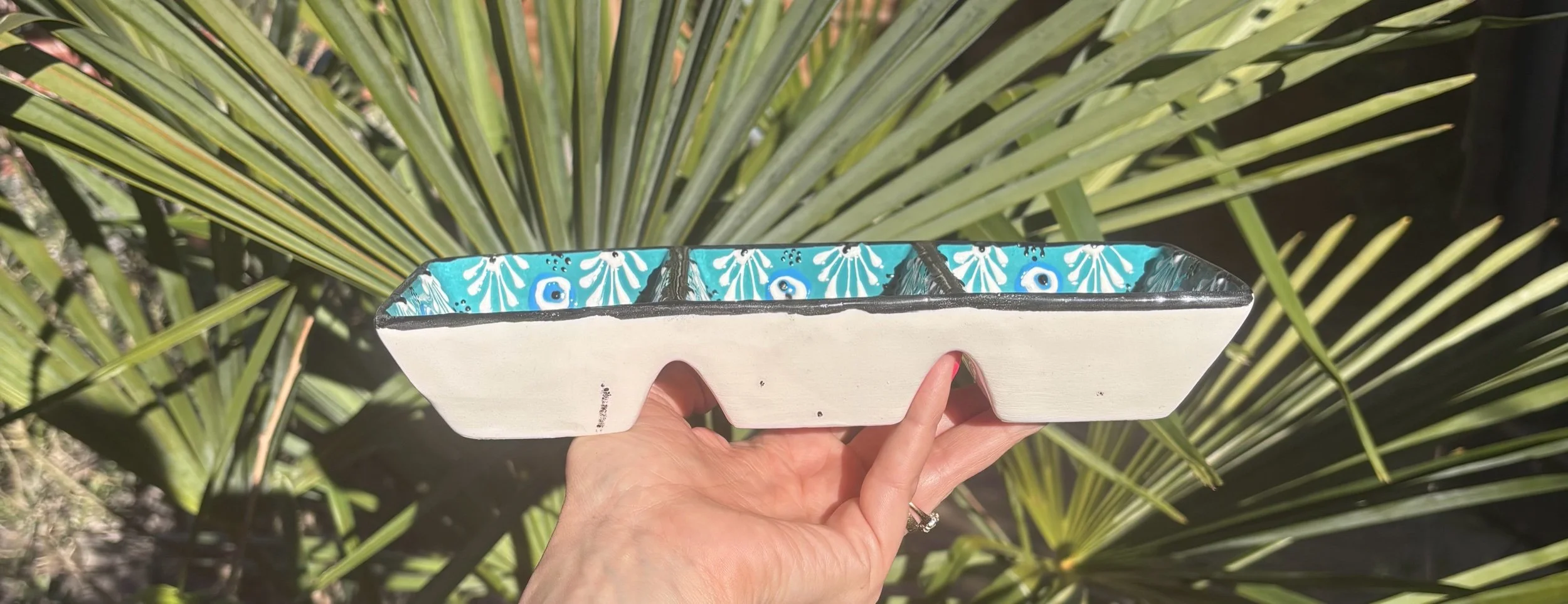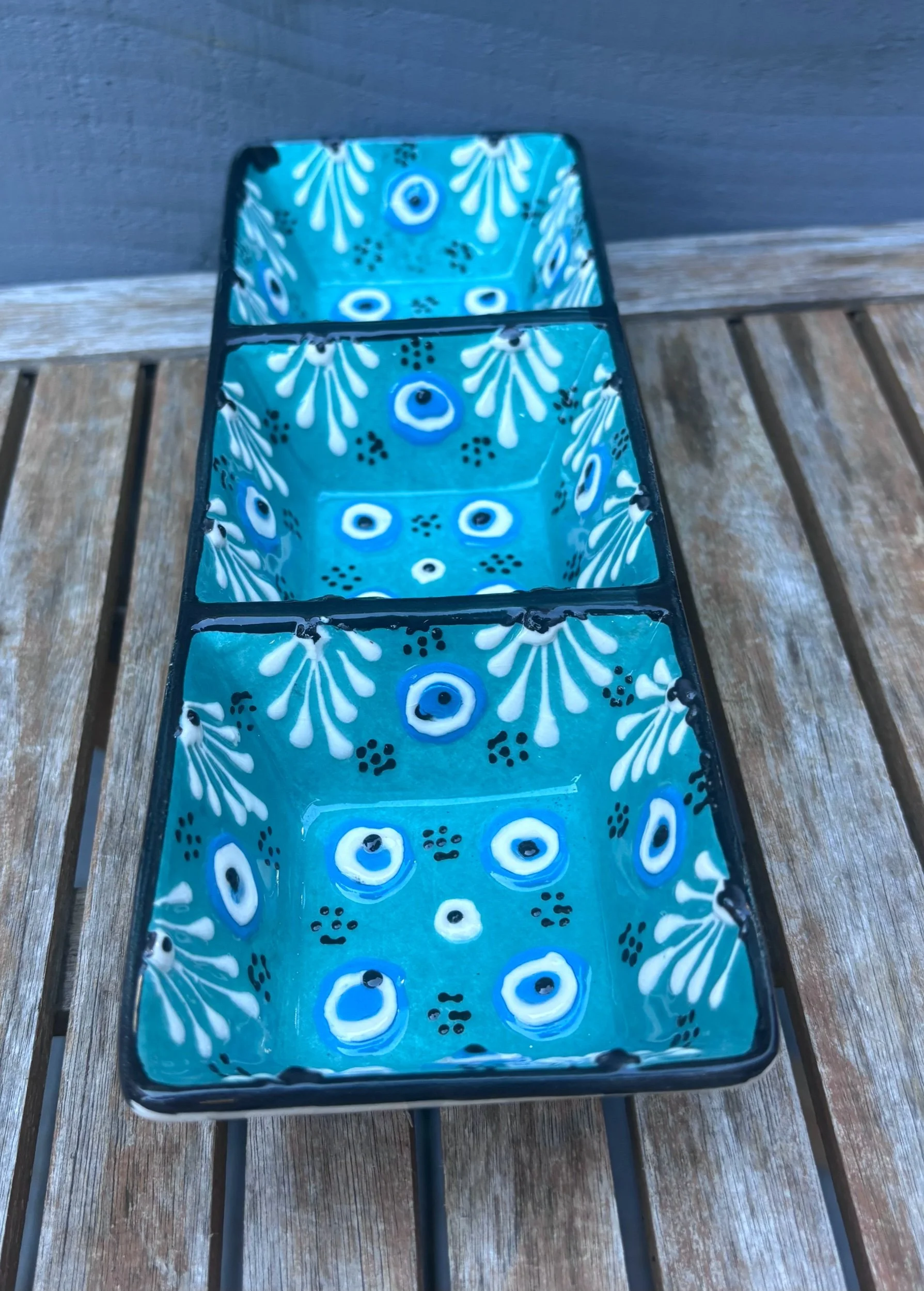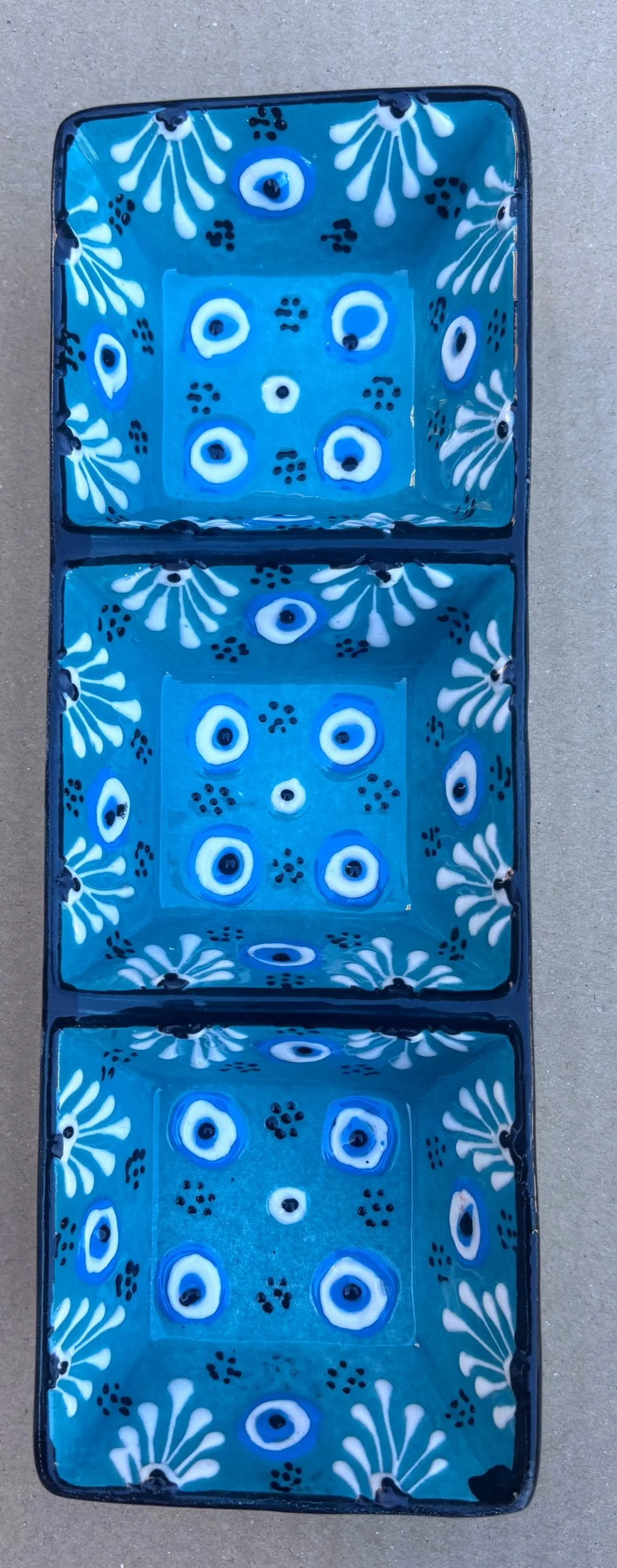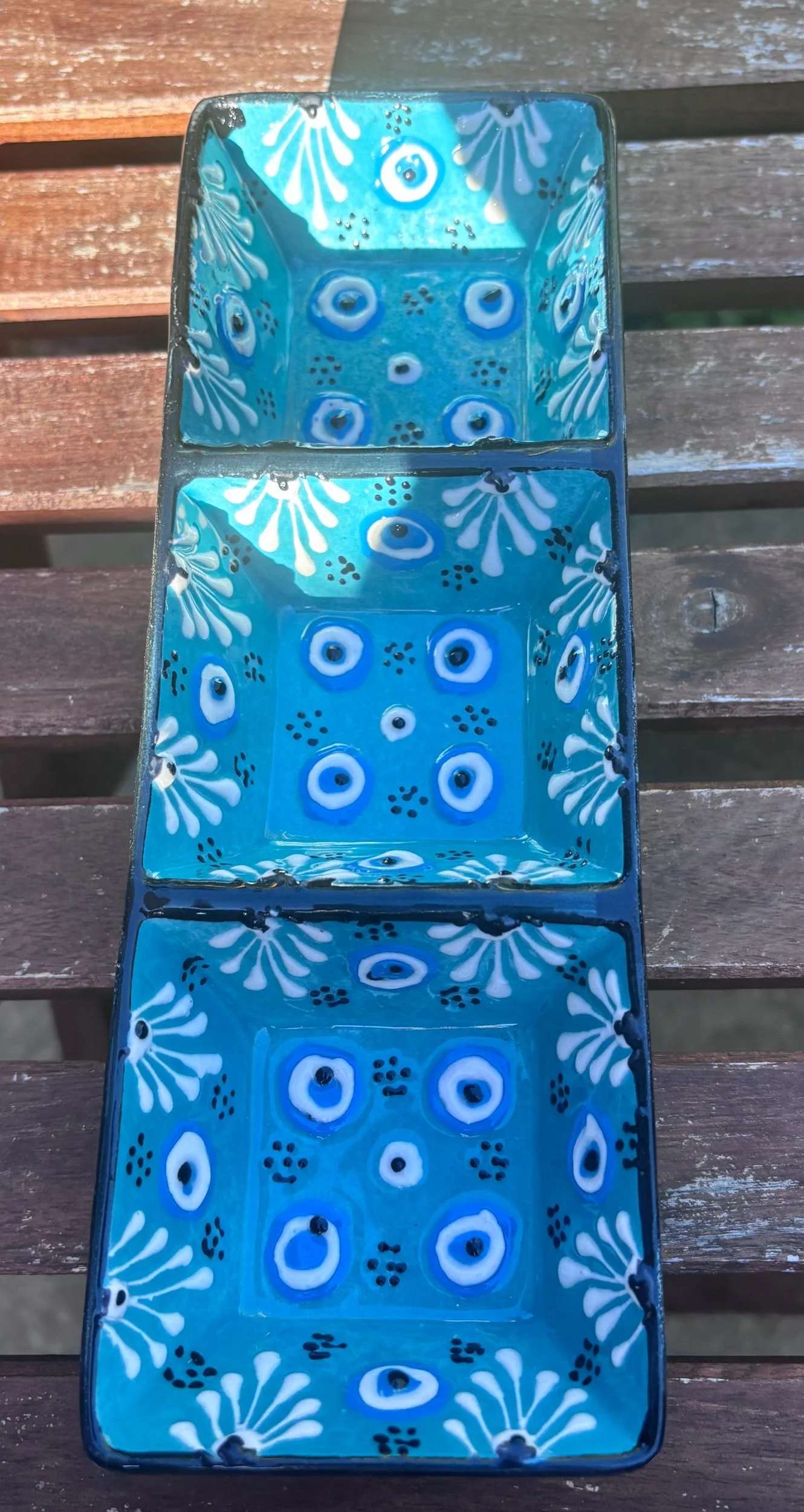 This beautiful three-compartment snack bowl is the perfect way to bring the spirit of the Greek Isles to your table. Hand-painted with a turquoise background and accented with white "Evil Eye" (Mati) motifs, itβs designed to protect your home from bad energy while keeping your guests well-fed! ππ₯¨