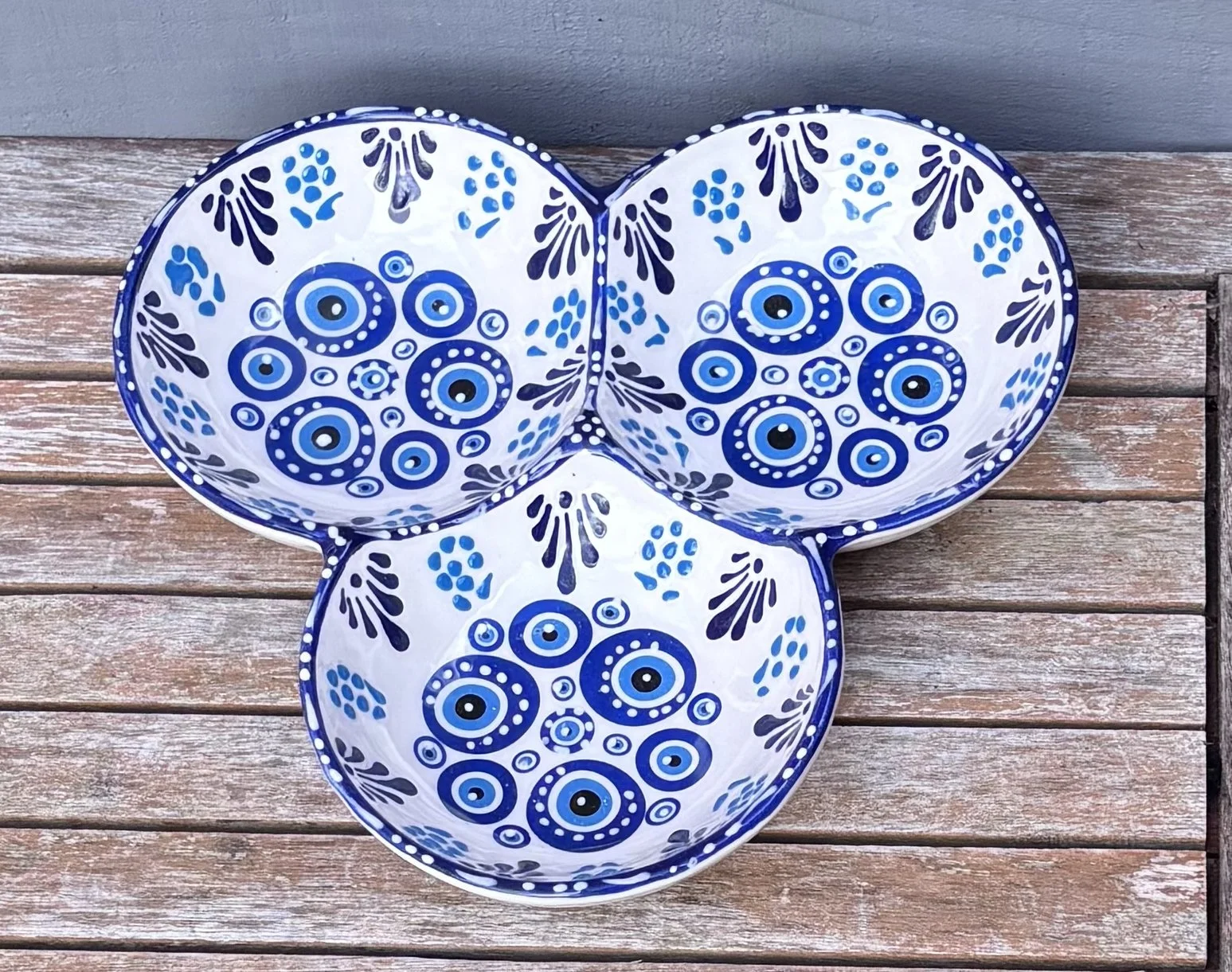 Hand-Painted Greek Blue Three-Part Snack Server β Evil Eye Nazar Design β Artisan Ceramic Nut and Dip Bowl