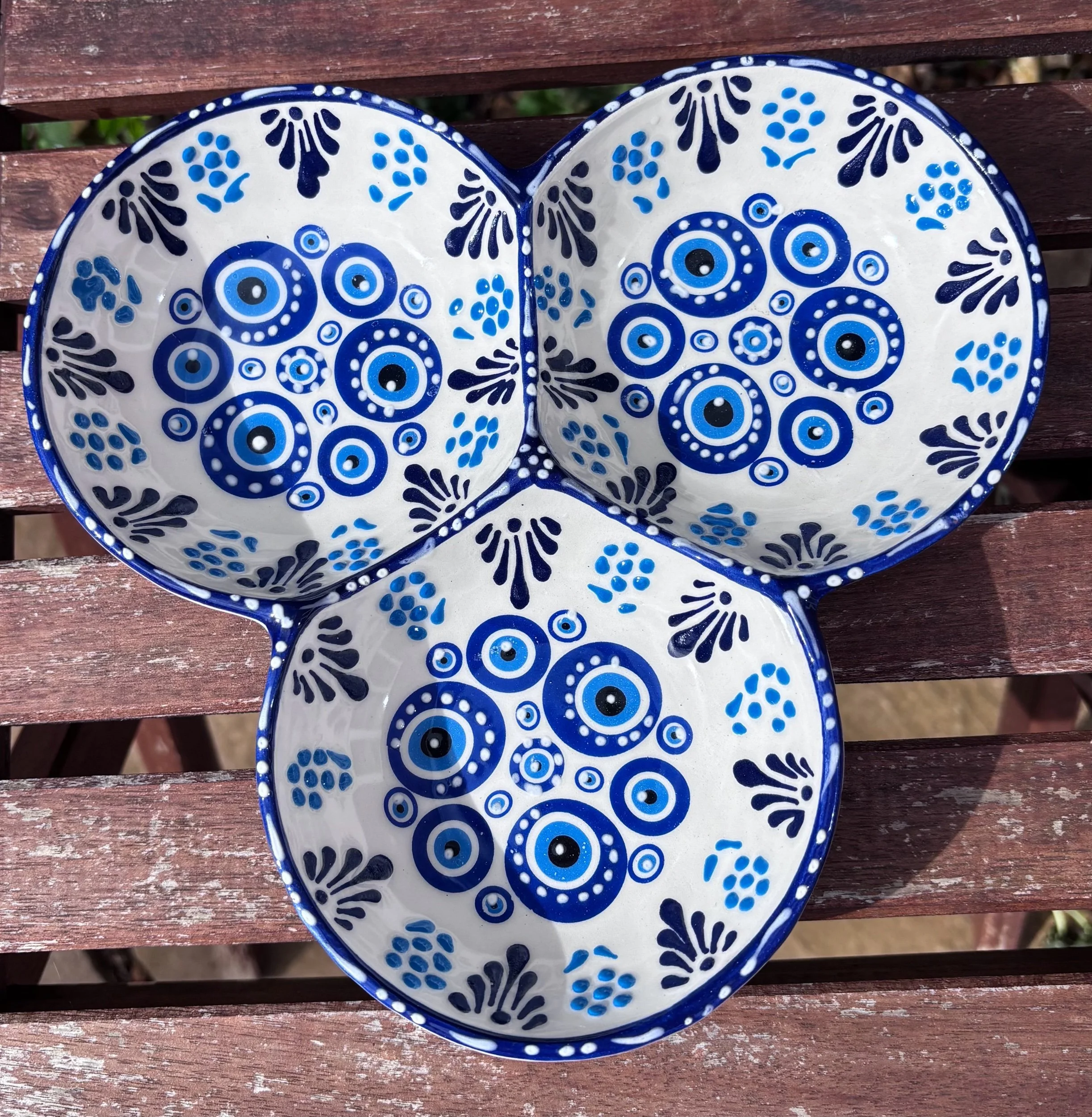 This stunning three-part snack bowl is hand-painted with the iconic Greek "Evil Eye" (Nazar) motif. Dressed in classic Mediterranean blue and crisp white, itβs designed to bring both protection and effortless style to your home. π¬π·π